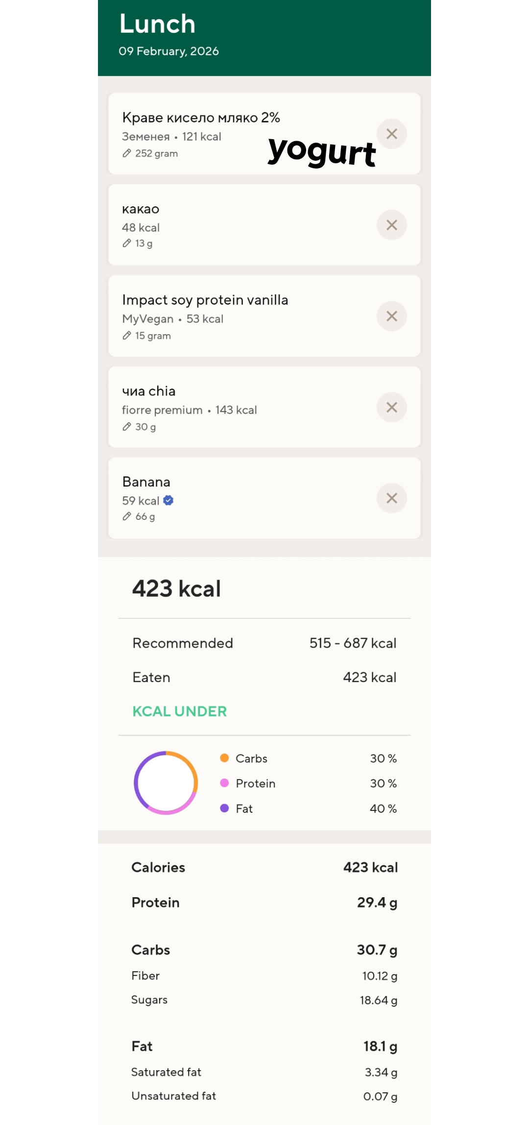 Lunch is a chocolate chia yogurt 423c