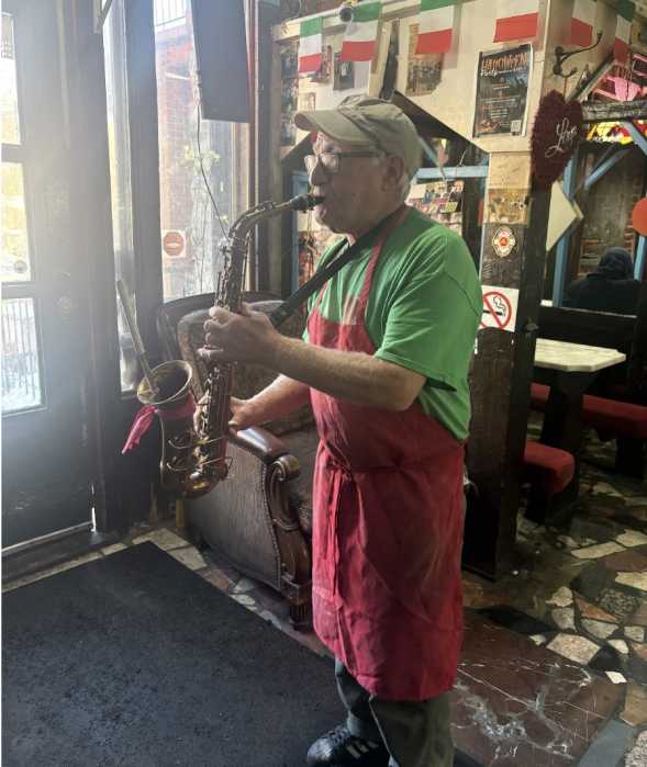 Salvatore Natale, Owner of Pugsley Pizza for more than 30 years still playing saxophone for regular customers. Photo by Bridgette Leahy
