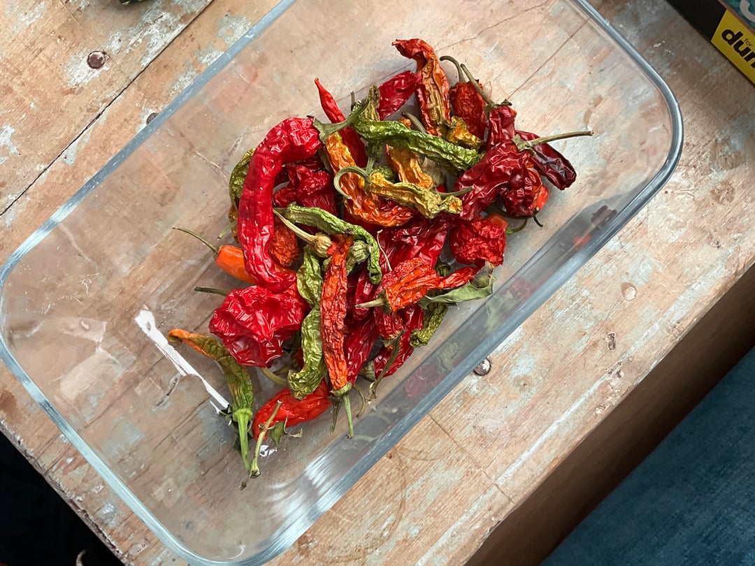 Some of my peppers from this past growing season lived in the kitchen fruit basket (with air circulation) until they started to shrivel. Then they were moved to this open glass container still out in the kitchen. My question is – is room temp air drying a thing for peppers? I never found black spots or mold on these and some of them are quite dehydrated.