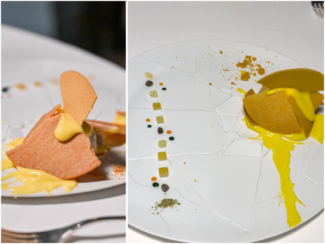 The iconic dishes Massimo Bottura became renowned for did not disappoint. Five ages of parmesan was a trip through flavor and texture, presented entirely by cheese. "Oops, I dropped the lemon tart" was a hit in both taste and presentation. Tart, tangy and delicious on a plate made for the dish itself.