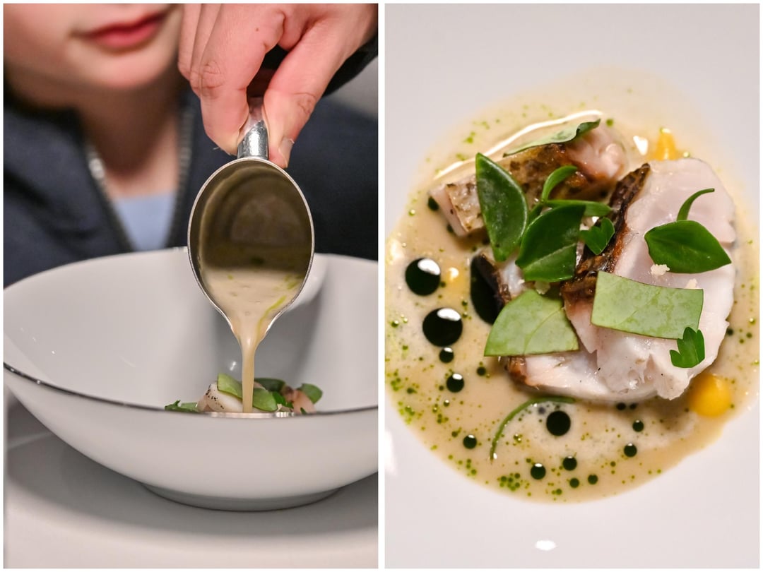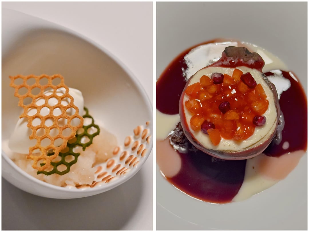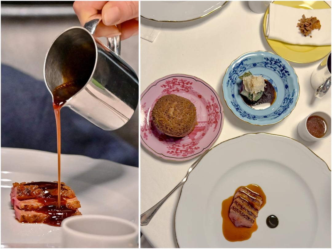 The penultimate savory course – "Jazz duck improvisation" – was an epic, all-hands presentation of protein, sides, broth and bread woven with rich duck flavor and surprises. A charred vegetable reduction on the cabbage side dish unexplainably had no dairy or meat whatsoever – a triumph of saucework.