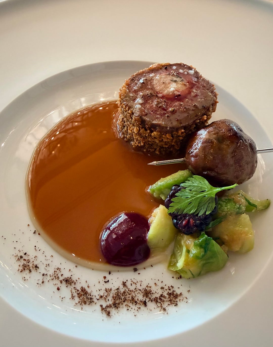 – Meat course was roasted venison with farce in the center, served with a skewer of meatball, brussels sprouts, blackberry and meat sauce (16th pic) 9.5/10