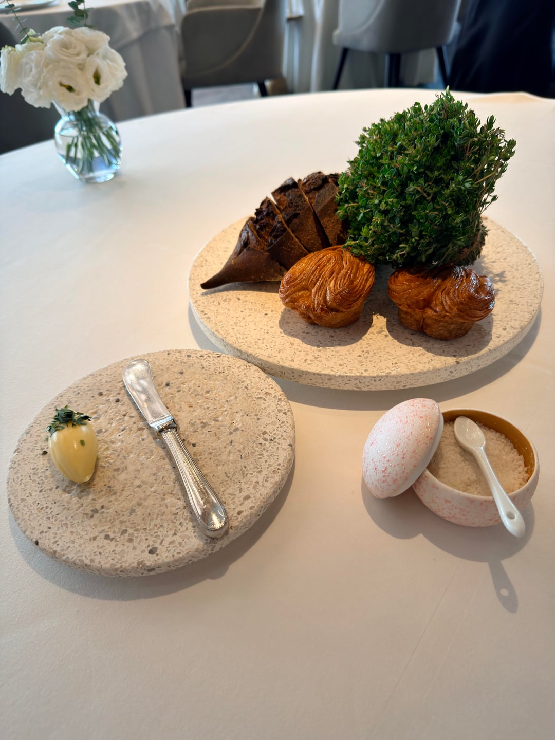 – After the soup was the bread serving, consisted of croissants and sourdough, served with butter and thyme (11th pic) 9/10