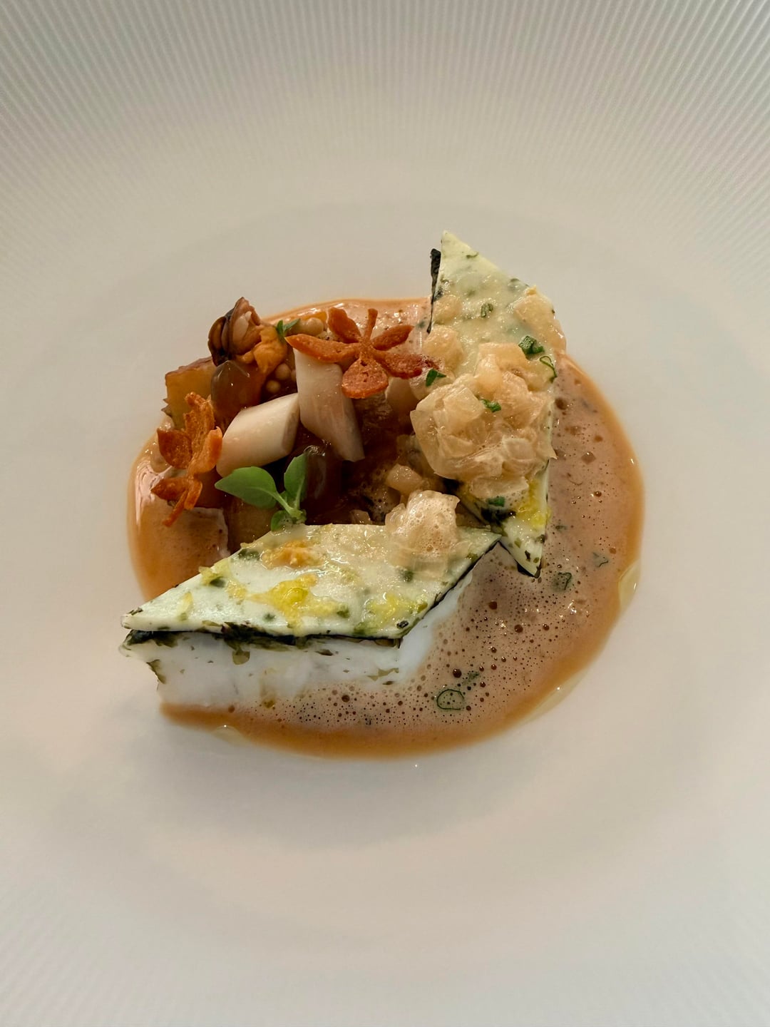 – Fish course was wild seabass topped with seaweed and farce, on the sides is razor clams, mussels, crispy tuiles, vinegar gel and served with bisque-like sauce (15th pic) 9/10