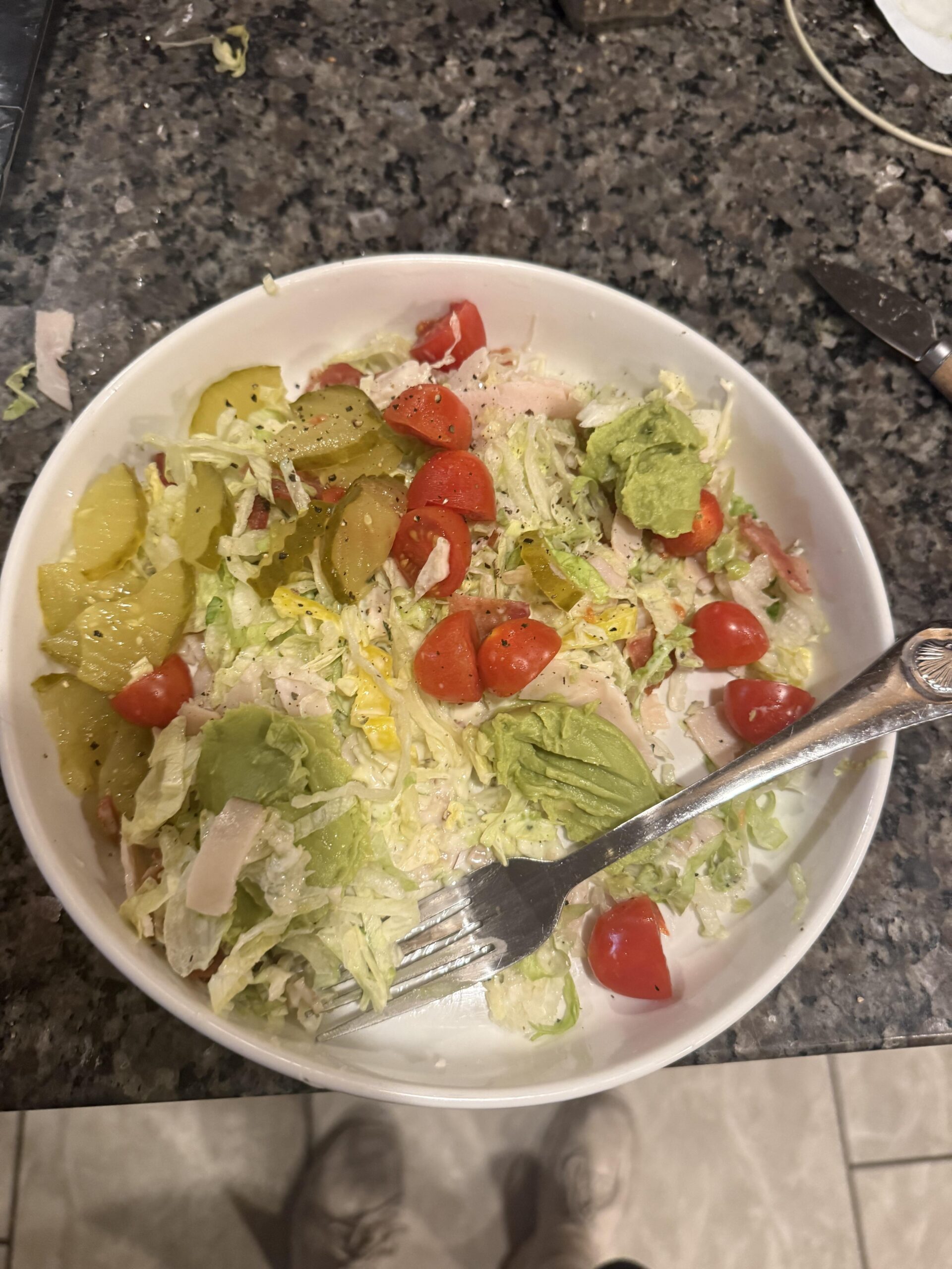 5.5oz Deli turkey, 2 pieces of Oscar Meyer bacon, a wholly avocado mini cup, lettuce, tomato, banana peppers & pickles. Tossed in light mayo & red wine vinegar. by grannyhobbier Dining and Cooking