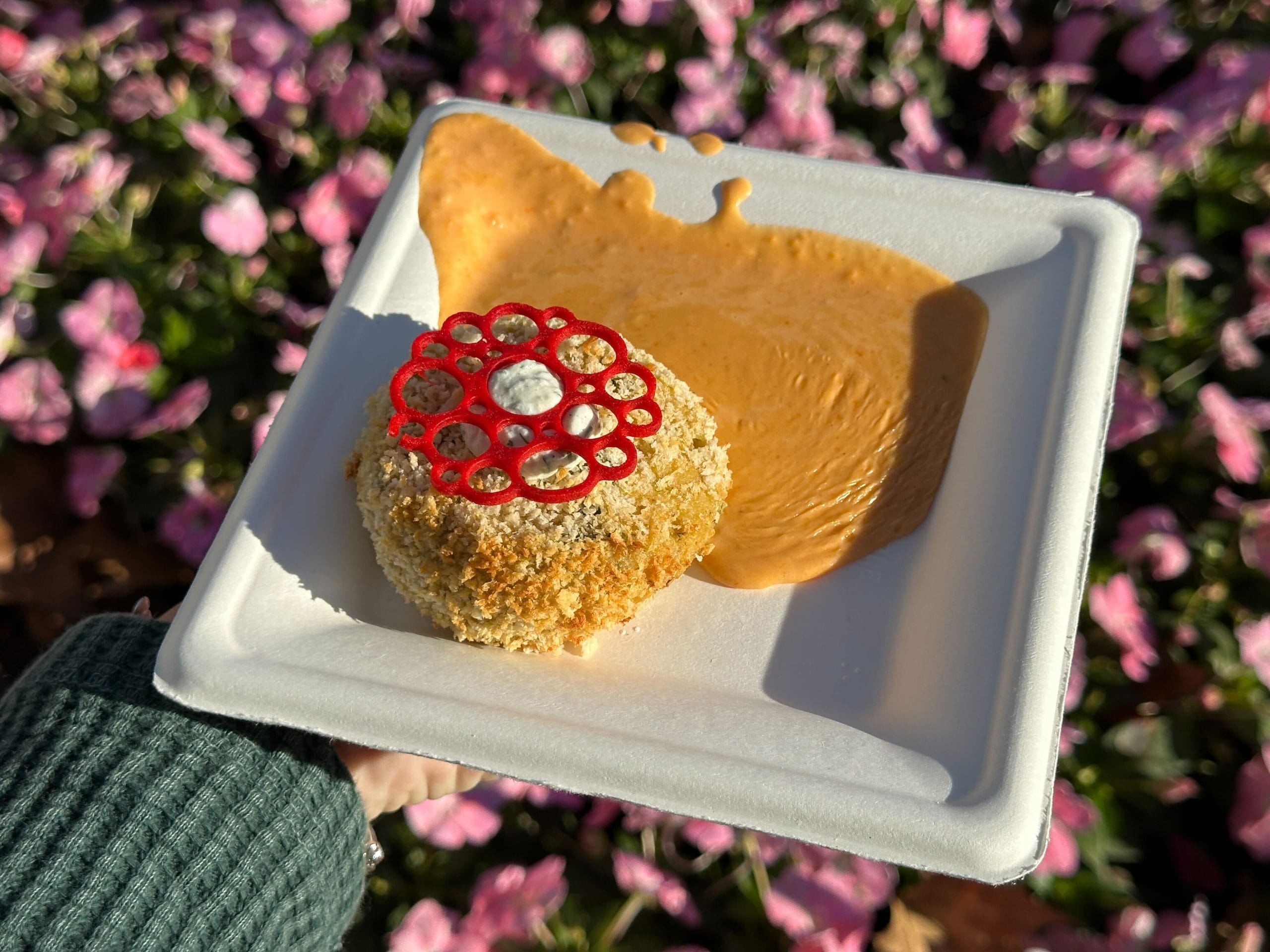 This is fantastic. The lemon-dill sour cream is perfect on the back end. The crab cake and lobster bisque are also delicious, offering a hearty dish for the festival. We rate this a 7 out of 7.