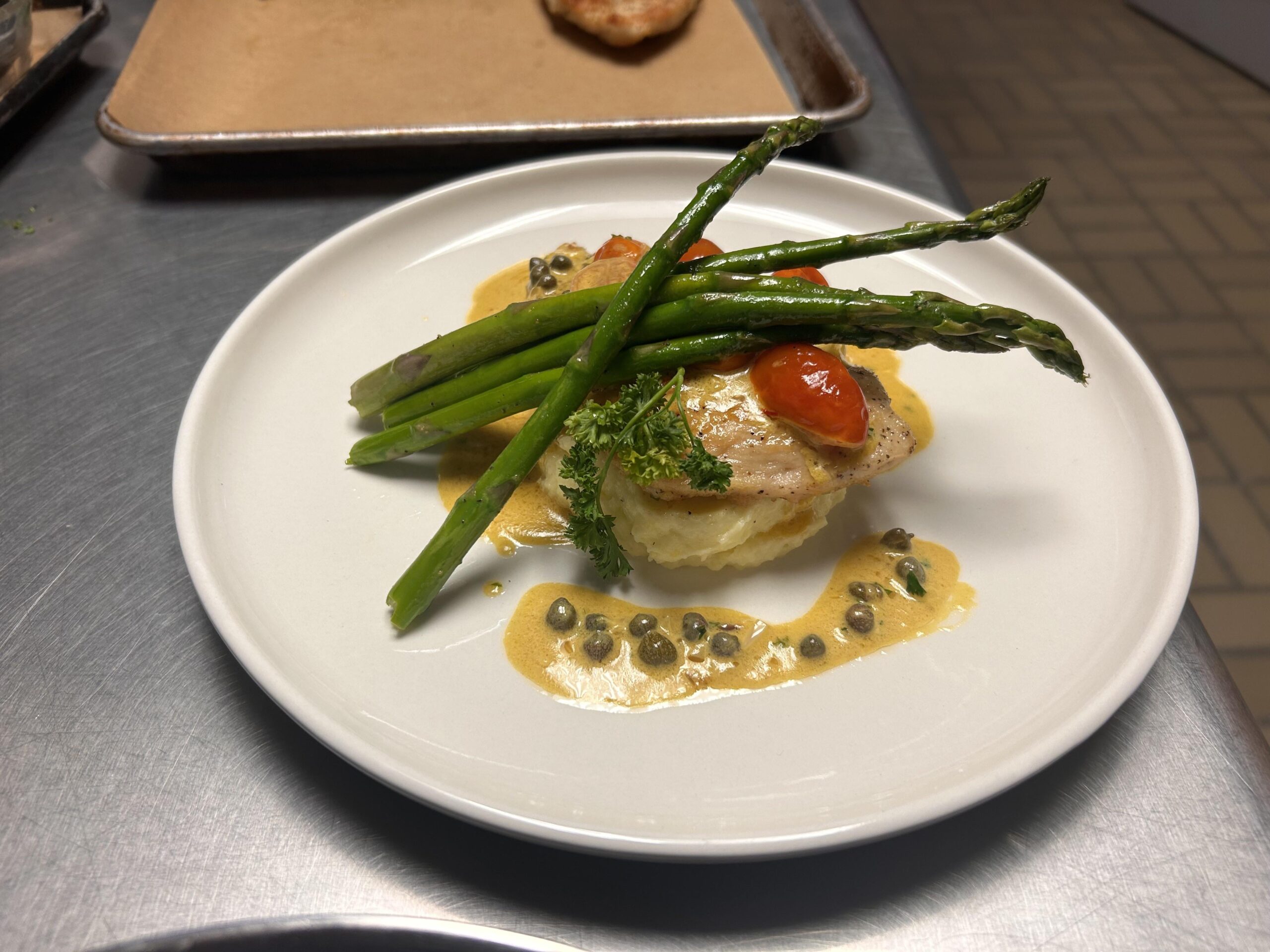 You’re colors look great, everything nice and tight on the plate, but don’t ever hide your proteins/star of the dish. Try putting your asparagus, tomatoes, etc. flat on the plate or draped over the mash and the chicken over the top of that so your vegetables don’t roll off the plate and the mash anchors everything down. Also, make sure to have the sauce over the chicken; the plate gets cold faster so your sauce will keep warm while keeping your chicken hot. Finally, finely chop your parsley and sprinkle that over the sauce so it can bloom.