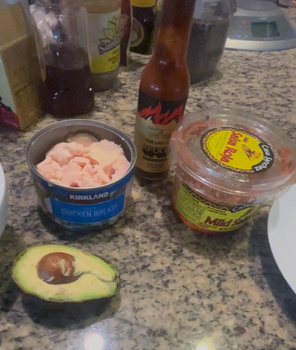 – 1 can chicken(I use 12.5oz)[5oz can is probably more preferable for the amount of avocado I used] ~210cals 45protein