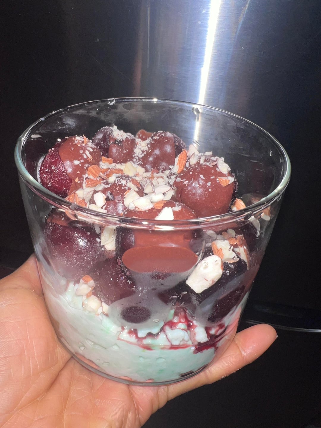 Cottage cheese bowl that includes cottage chees mixed with SF pistachio pudding mix, topped with frozen cherries , crushed almonds, and chocolate sauce .