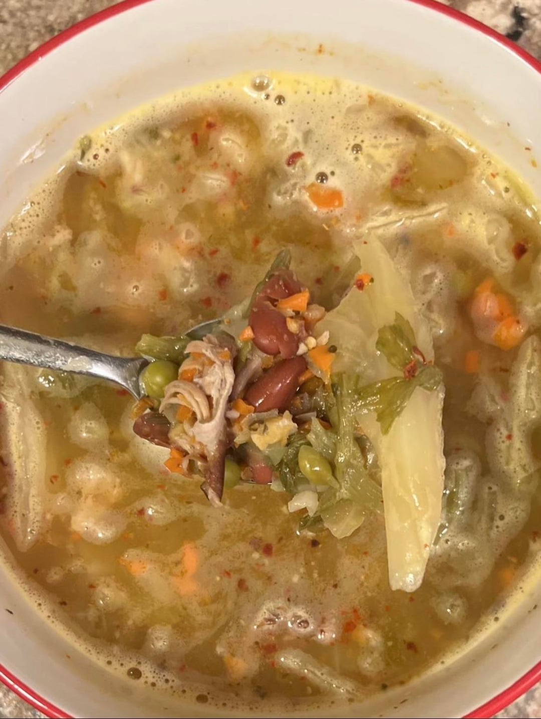 Cabbage stew/soup that includes cabbage, celery, kidney beans, sweet peas, minced carrots, onions, ginger, and garlic. I meal prep this for the whole week 😋