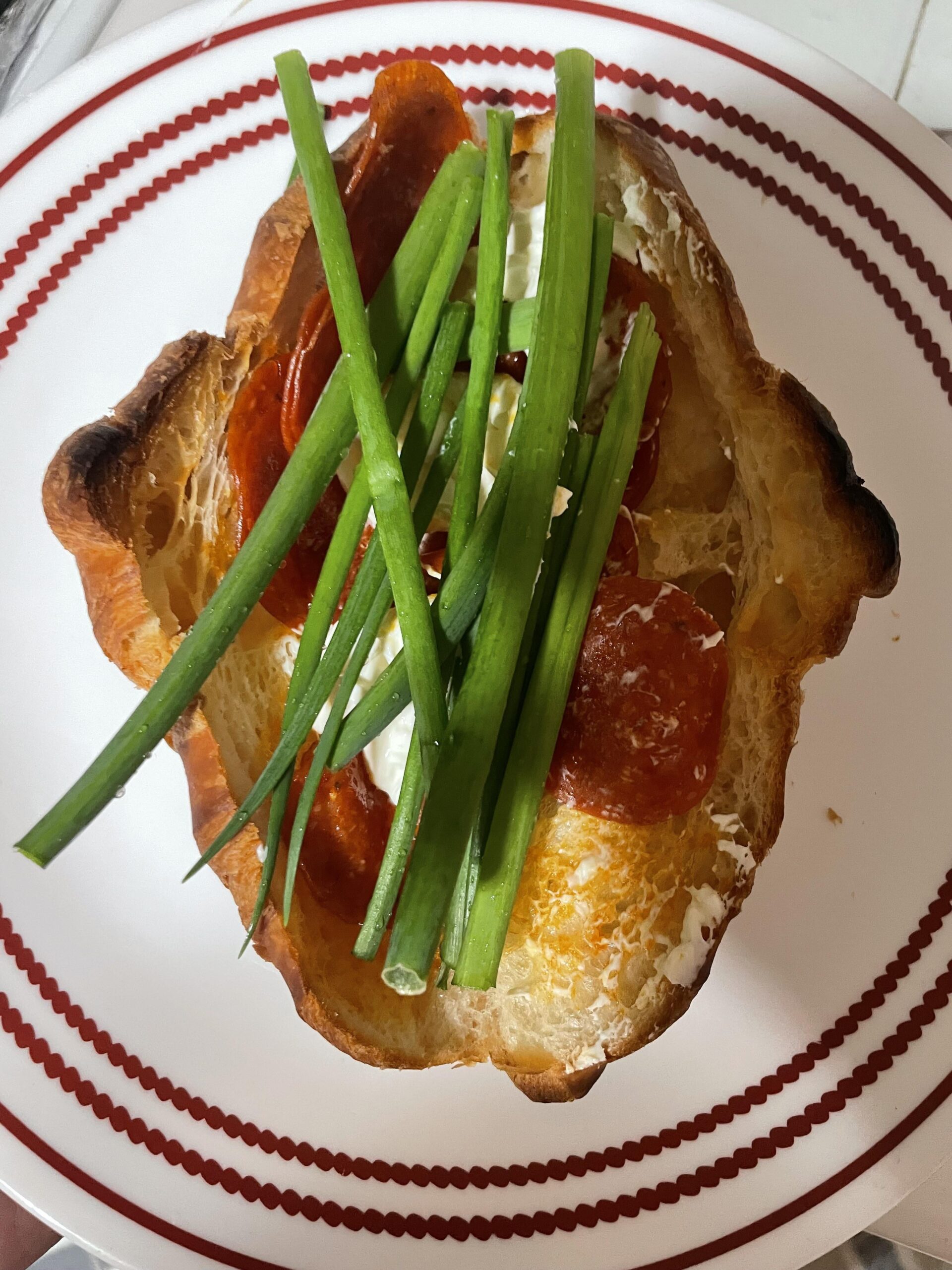 Toasted croissant and pepperoni with cream cheese and green onions