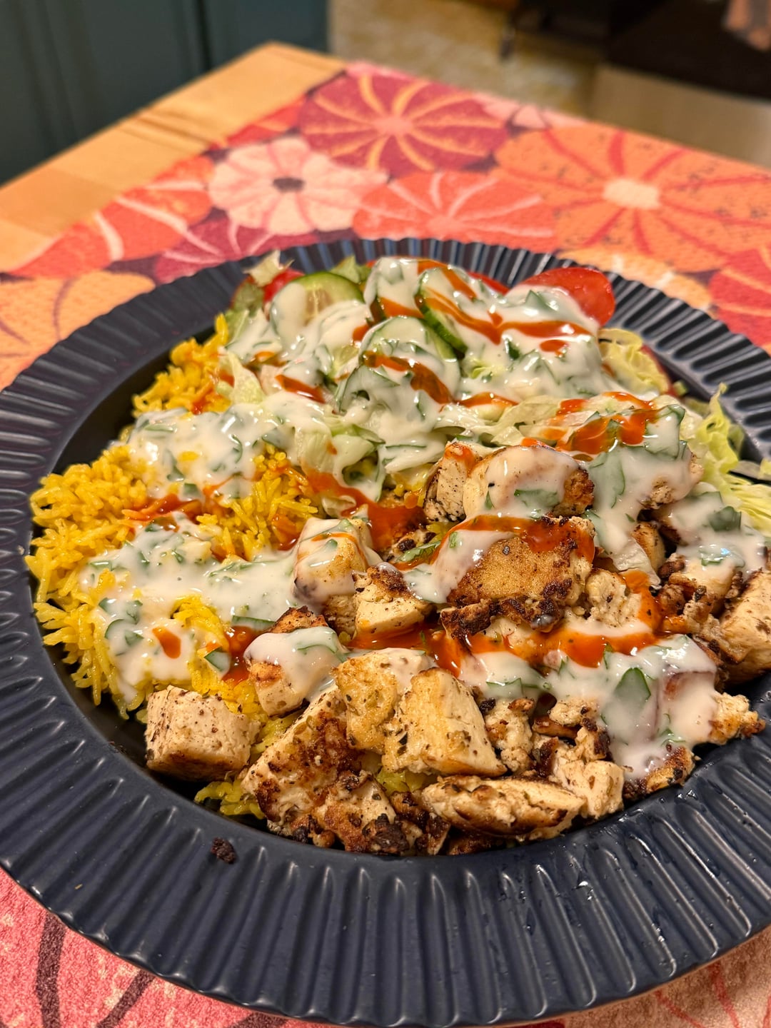 Used to live in a big city and now I live in a rural area, it’s so hard not having access to the best global food/culture. If I’m craving someone I gotta make it myself. This is vaguely based on Serious Eats’ halal cart recipe online using tofu instead of chicken and vegan mayo/yogurt instead of dairy. Only thing I’m missing here is the styrofoam clamshell and the genuinely delightful halal guys asking me how my family is doing.