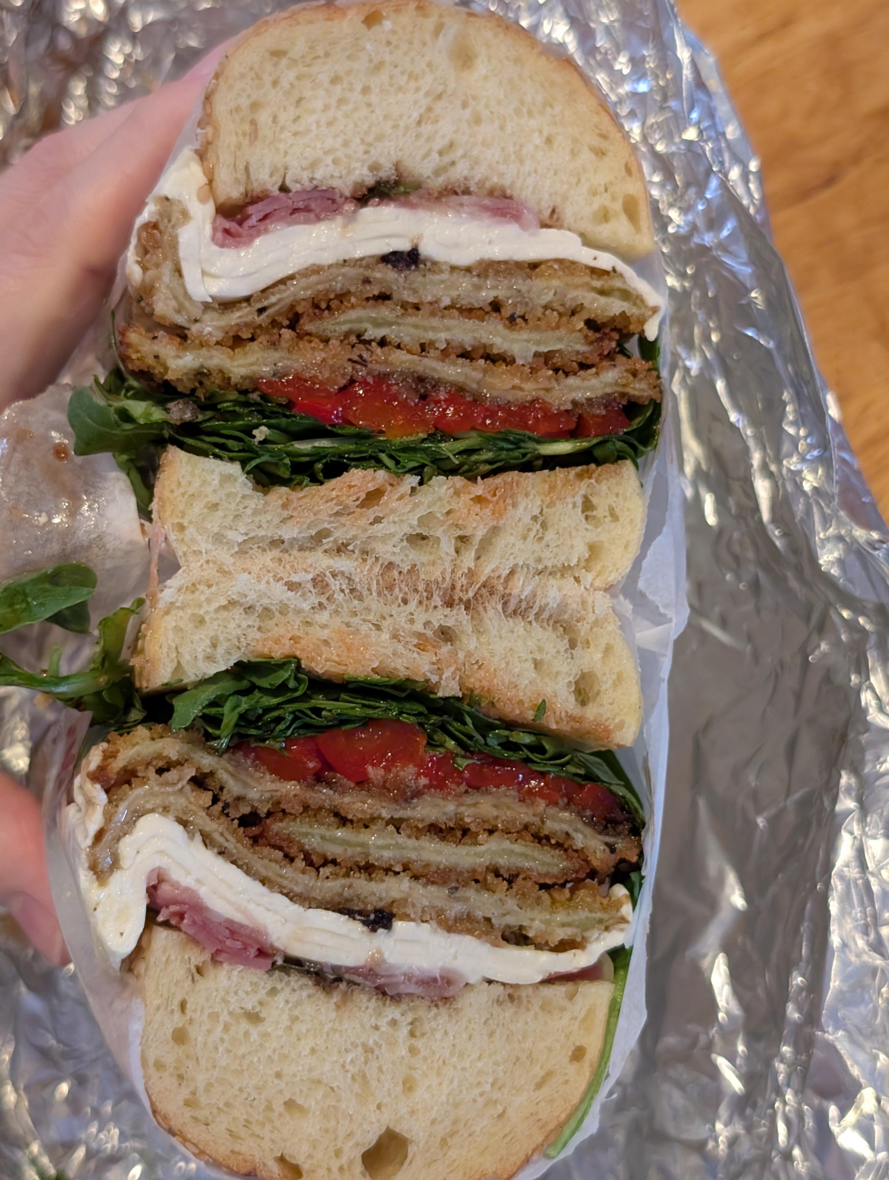 Fried eggplant, fresh mozzarella, arugula, roast red peppers, prosciutto, balsamic glaze, semolina bread 🤤🤤🤤 by MaryjanePaige 10 Comments BCjeff21 4 weeks ago I’m always too chickenshit to try fried eggplant, what would you compare it to? BoboBroBoBoBoBo 4 weeks ago Holy shit that looks incredible AvaInZoeyVerse 4 weeks ago That looks incredible! MagazineDelicious151 4 weeks ago Looks like a great eggplant sandwich Frequent-Cabinet-689 4 weeks ago Oh hell yeah brother plantymom3 4 weeks ago Oh wow that sounds and looks AMAZING!!! Jumpy_Round_2247 4 weeks ago What deli? Setsailshipwreck 4 weeks ago I loooooove fried eggplant. That looks amazing and delicious pepstein 4 weeks ago Bruh Alternative_Zone_534 4 weeks ago Yummy