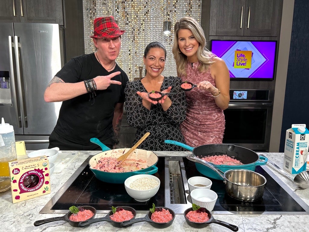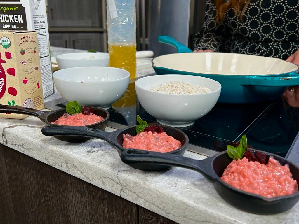 For a seasonal variation, Chef Amy incorporates beets to give the risotto a pink hue. She recommends using either fresh roasted beets or pre-cooked beets that have been chopped. Because beets absorb surrounding flavors, she advises seasoning thoughtfully and using fresh basil and garlic rather than jarred alternatives.