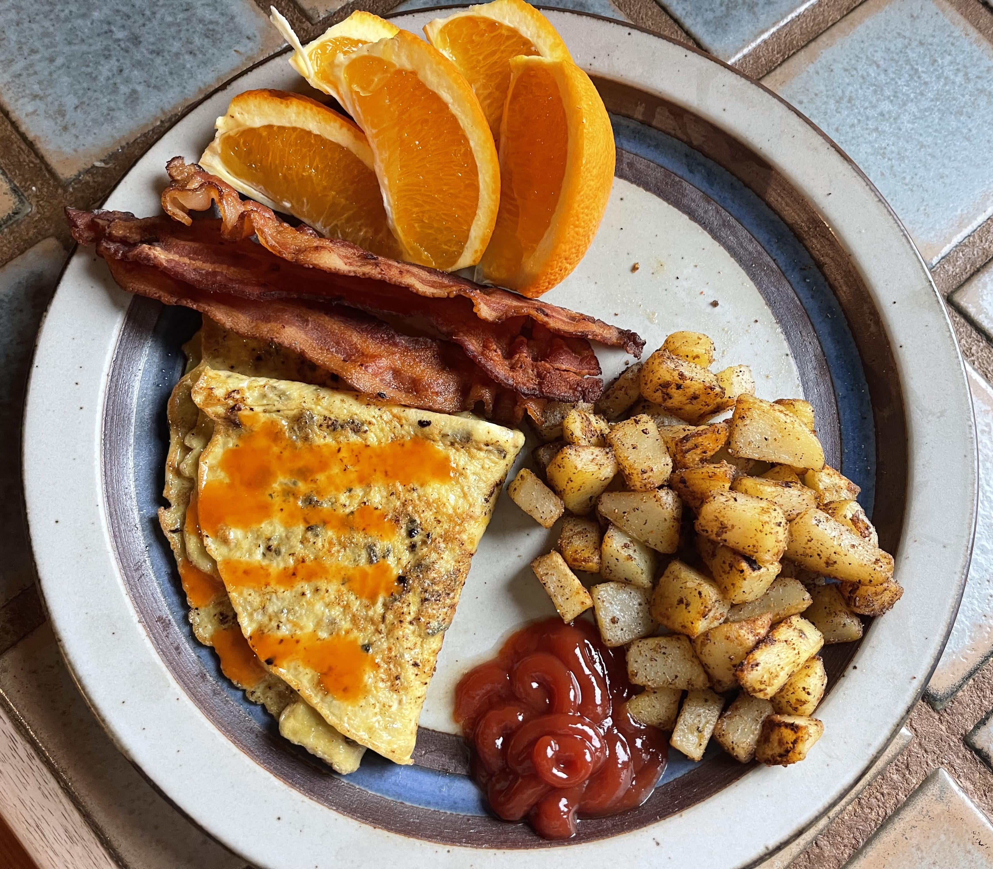 Fresh orange slices, bacon, omelette (with: cheese, shredded carrot, oregano & hot sauce), breakfast potatoes (one russet potato seasoned with salt/pepper/garlic powder/cumin/cayenne)