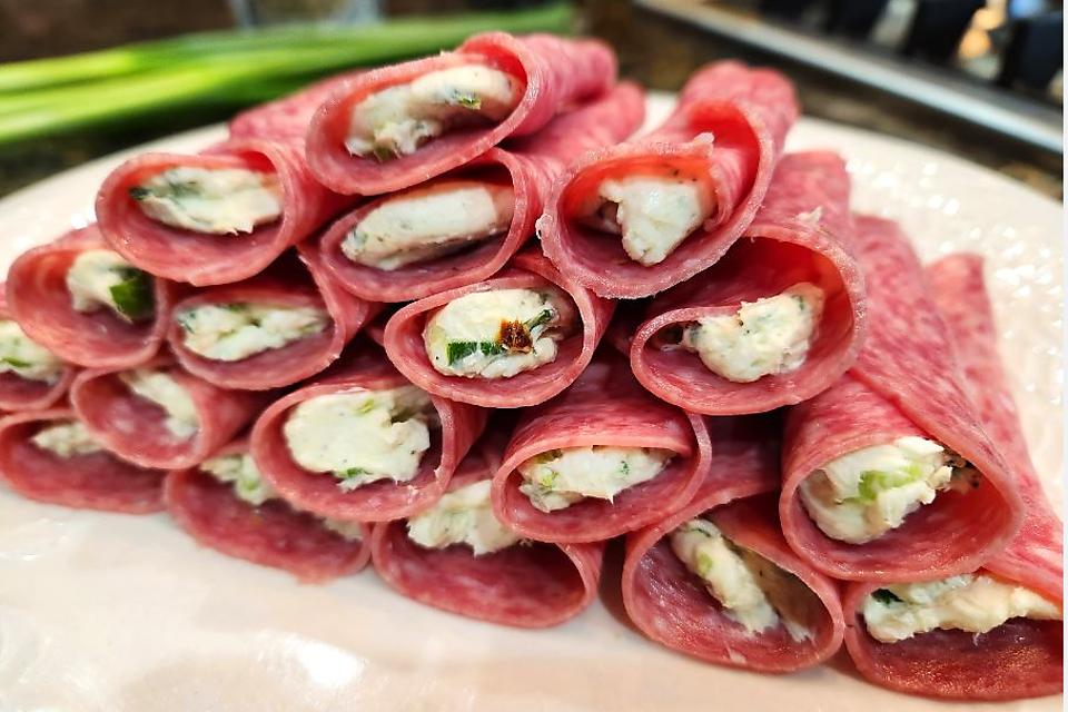 dried Italian seasoning, garlic powder and onion powder. The filling is whipped together and then rolled up in salami slices. I had toothpicks out to secure the rolls with, but found they stayed together with no problem, so opted not to use them.