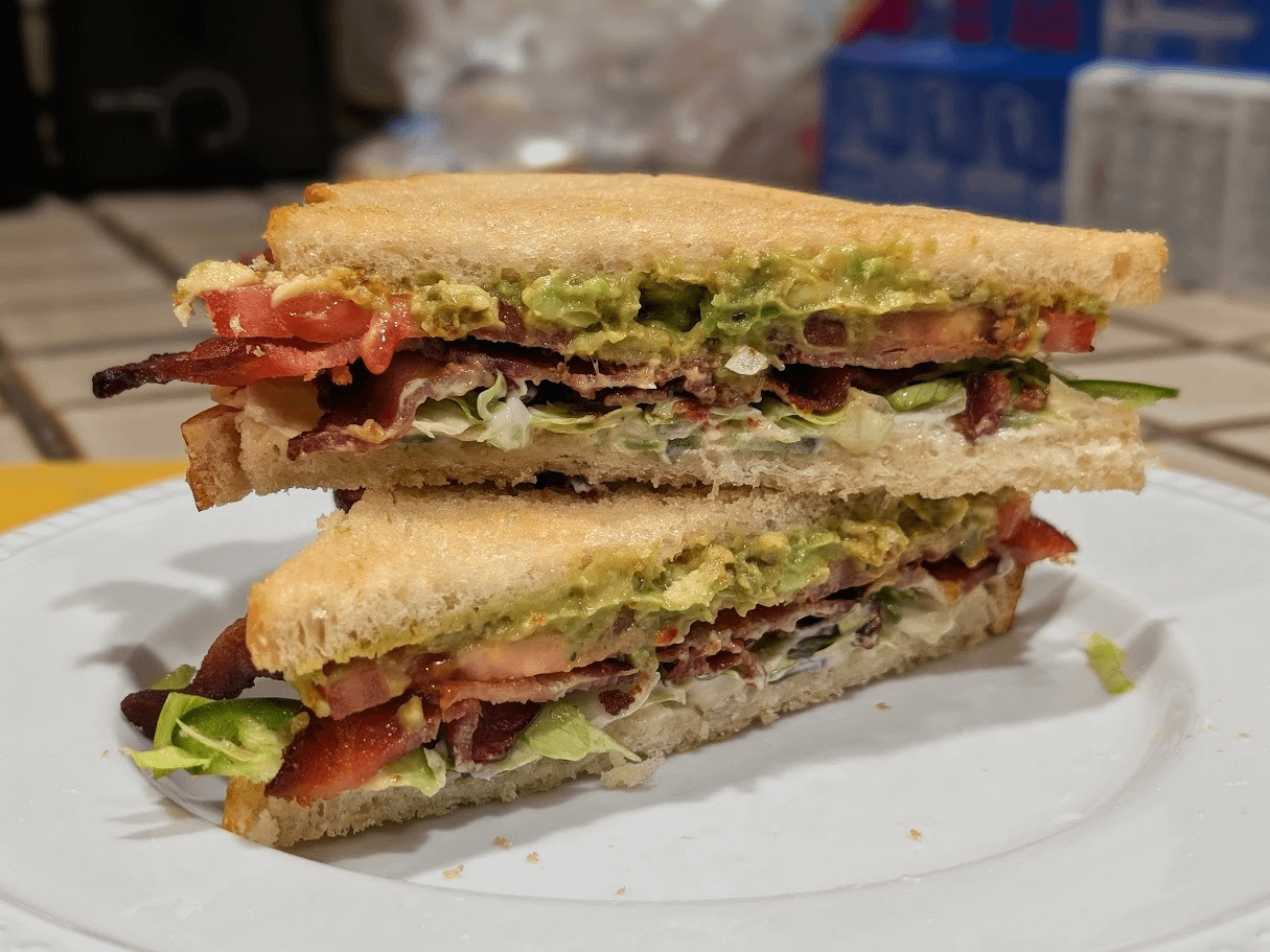 Six slices of bacon, 4 slices of tomato, shredded lettuce, 8 razor thin slices of fresh jalapeno, and avocado mix with chili onion crunch on toasted sourdough.