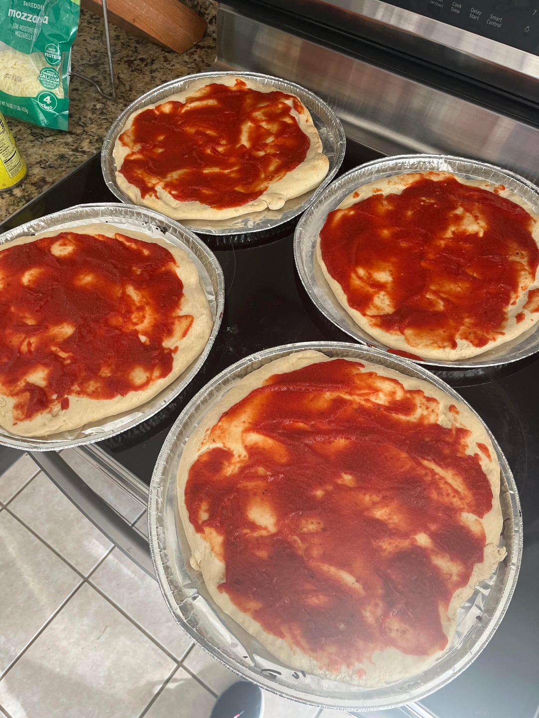 Dough: 4 cups warm milk, 28 g yeast (4 packets), mix & let sit for 8-10 minutes. Add 8 cups flour, 4 tbsp olive oil, 2 tbsp salt. Knead for 10 minutes. Let double in size. Divide into 4 equal portions.