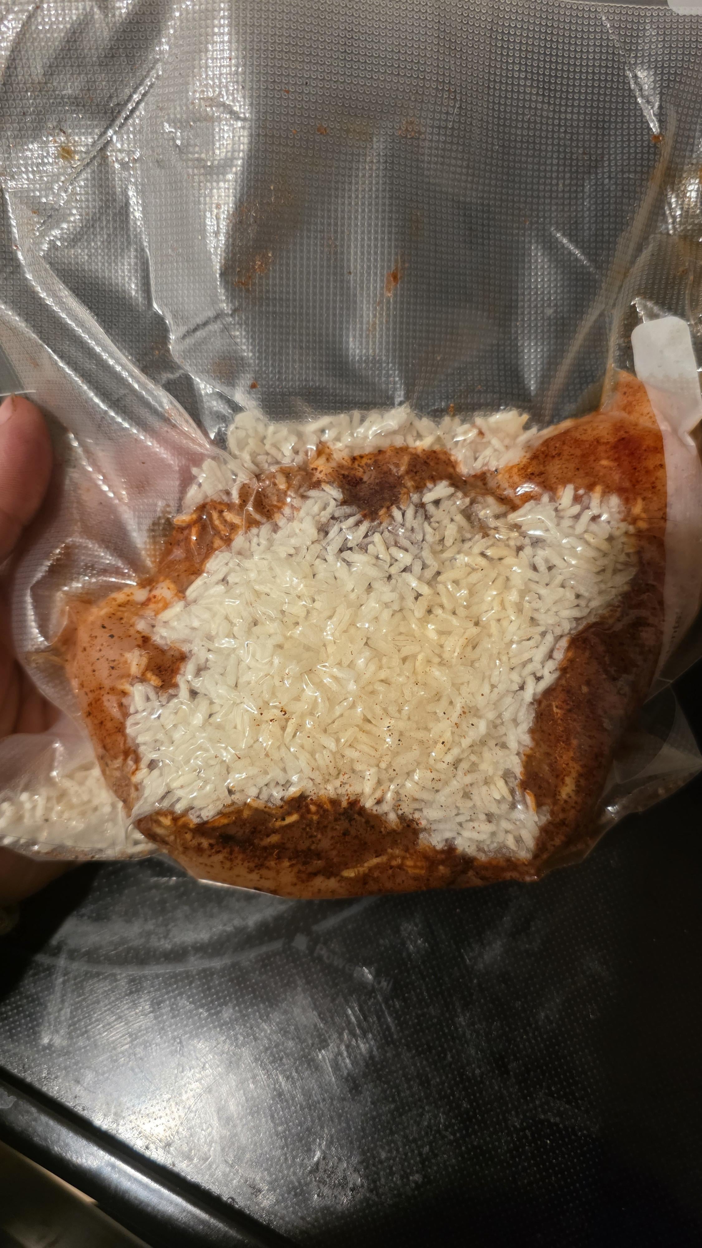 If this doesn’t work, try soaking the rice prior to bagging it. You need about 2x the rice weight in liquid, so 50g of rice would need about 100g of liquid to fully cook. Not sure how much liquid will come off the chicken. But even rice cooker chicken uses the full amount of water.