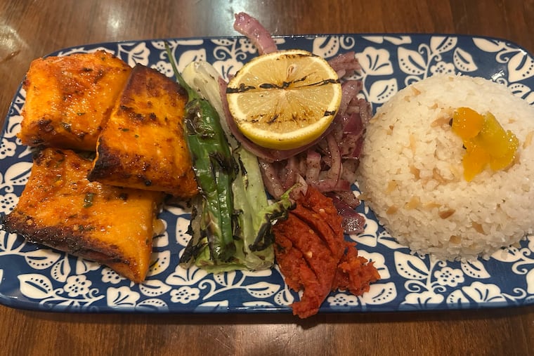 Skip to contentThe salmon kebab from Kanella comes plated with grilled green lettuce, fiery red harissa, sweet purple onions, and a wedge of lemon.The salmon kebab from Kanella comes plated with grilled green lettuce, fiery red harissa, sweet purple onions, and a wedge of lemon.Read moreZoe Greenberg / Staff