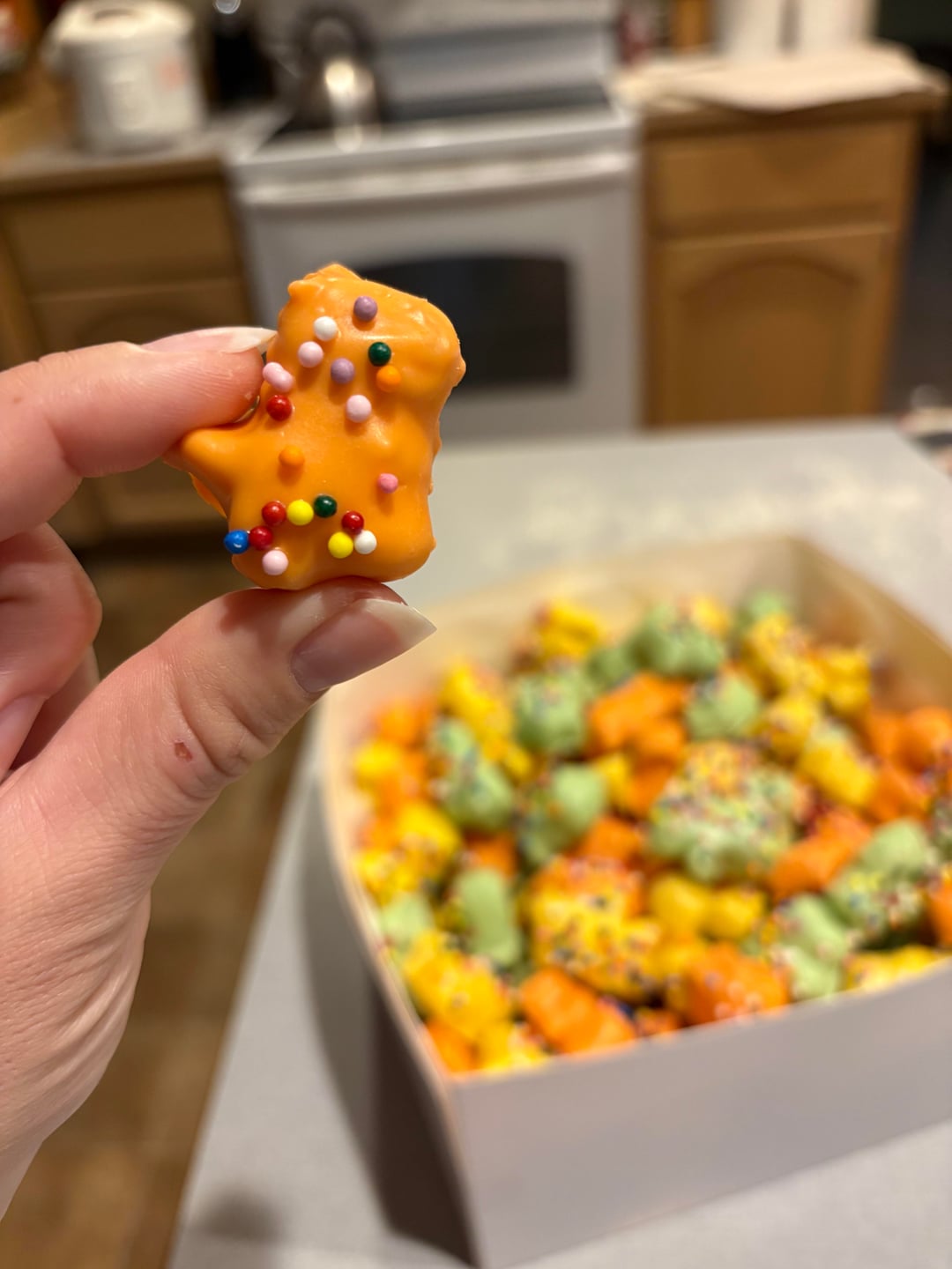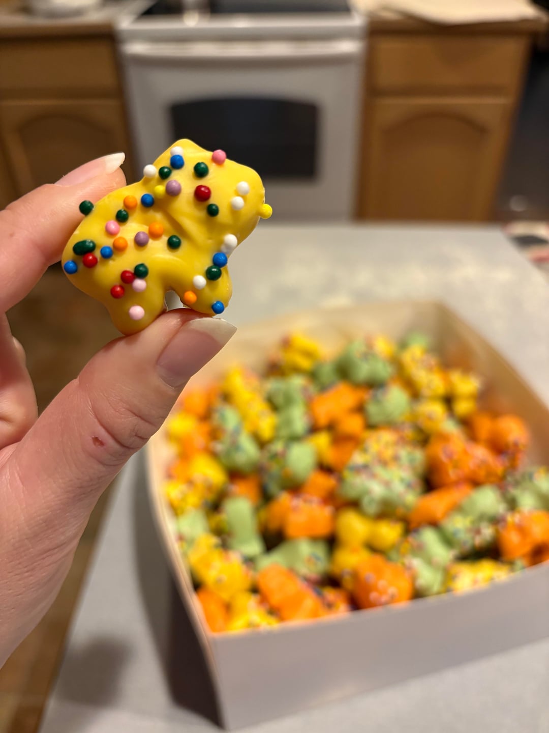 If putting sprinkles on the candy melt of a cookie with this kind of rise, I think adding extra loose sprinkles to the tray they’re hardening on and giving the tray a shake would help get sprinkles on the sides of the cookies too. Not just the tops. But I felt like I was already doing a lot.