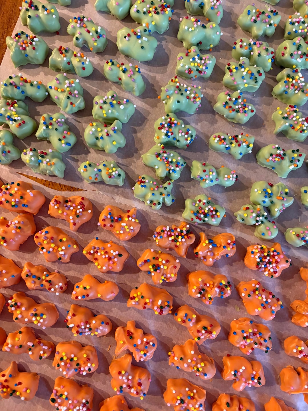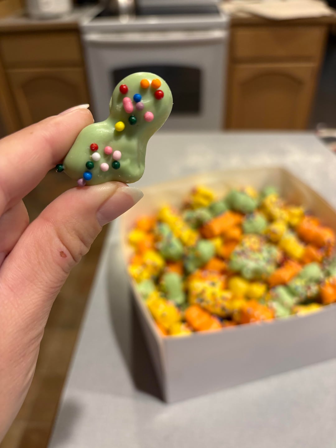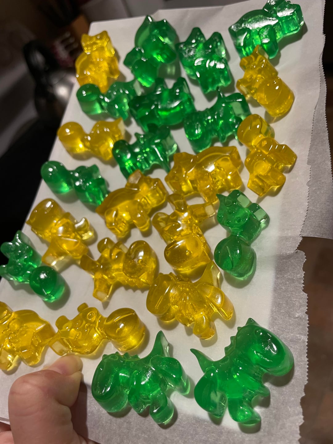 I used a dinosaur silicone mold to make the sugar cookies. The mold worked great for the gummy candies I made last month. Lots of detail. But I will never use a mold like that again for a candy melt cookie. The process was way too time consuming for something that would’ve gotten the same final detail results from a basic cookie cutter. (Last couple slides show the pre-candy melt cookies and the gummies).