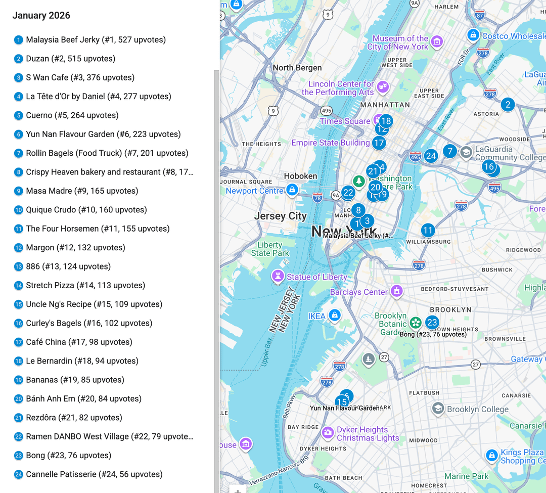 Here's this sub's top restaurants (by upvotes) for January, plotted on a custom Google Map.