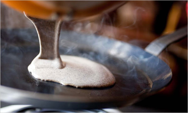 - Place a seasoned 7- or 8-inch crêpe pan over medium heat. Brush with butter or oil, and when the pan is hot, remove from the heat and ladle in about 3 tablespoons batter. Tilt or swirl the pan to distribute the batter evenly, and return to the heat. Cook for about one minute, until you can easily loosen the edges with a spatula. Turn and cook on the other side for 30 seconds. Turn onto a plate. Continue until all of the batter is used.