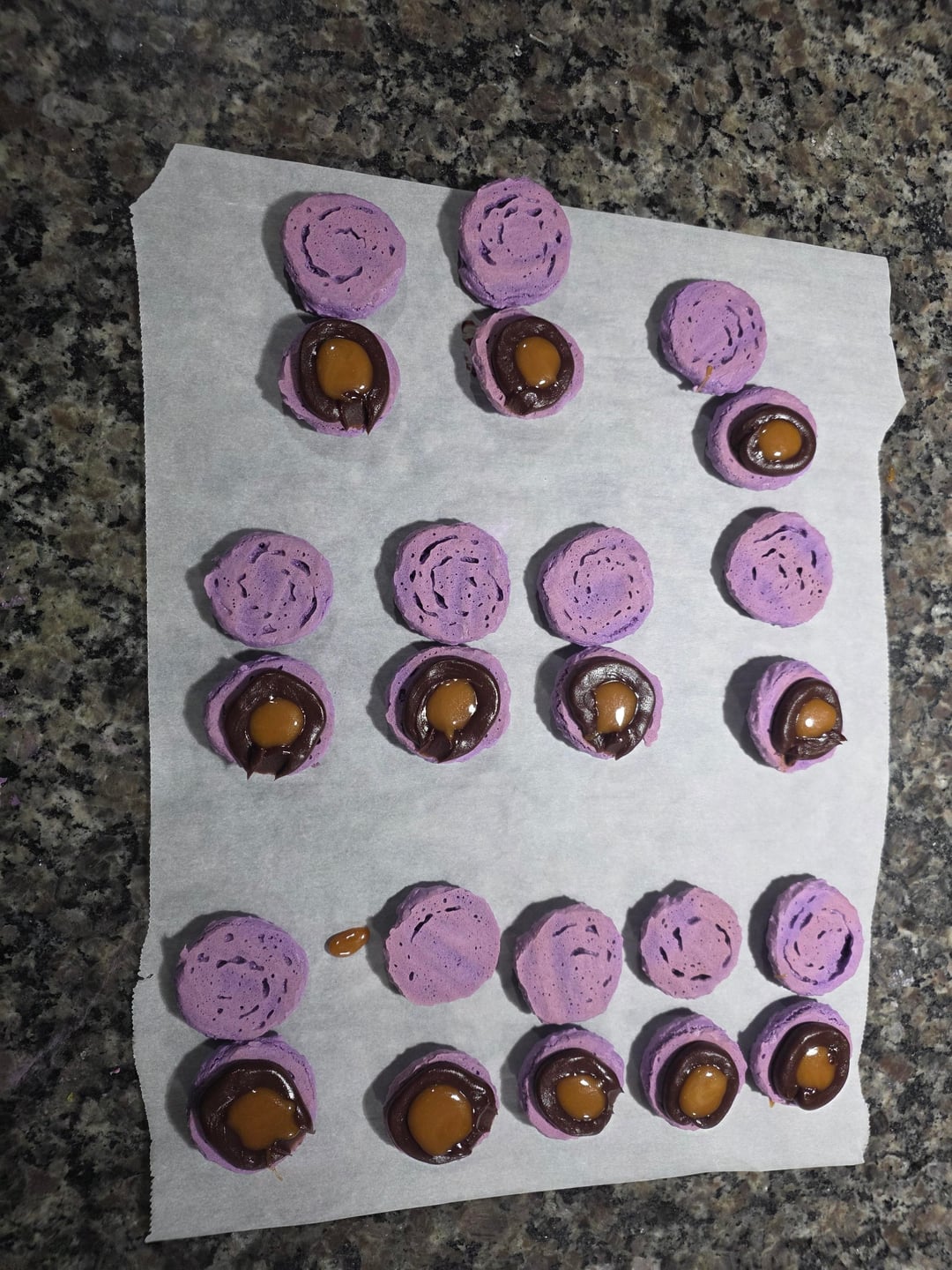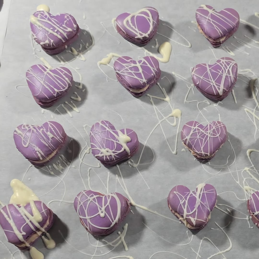 I made purple hearts and roses for valentines day! Made some pink ones too. the hearts are strawberry cheesecake and the roses are semisweet ganache with salted caramel.