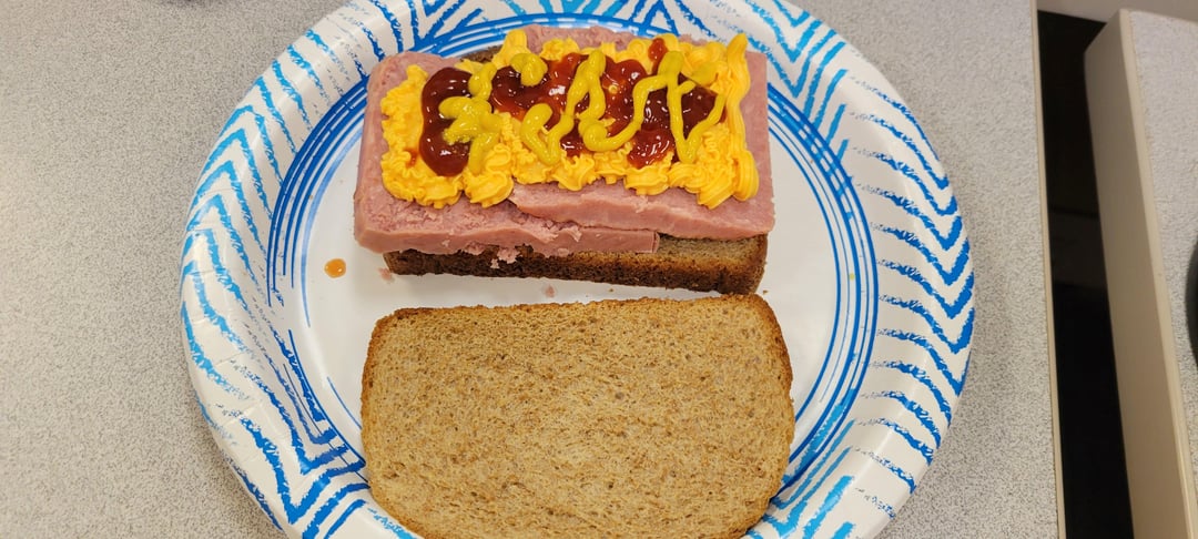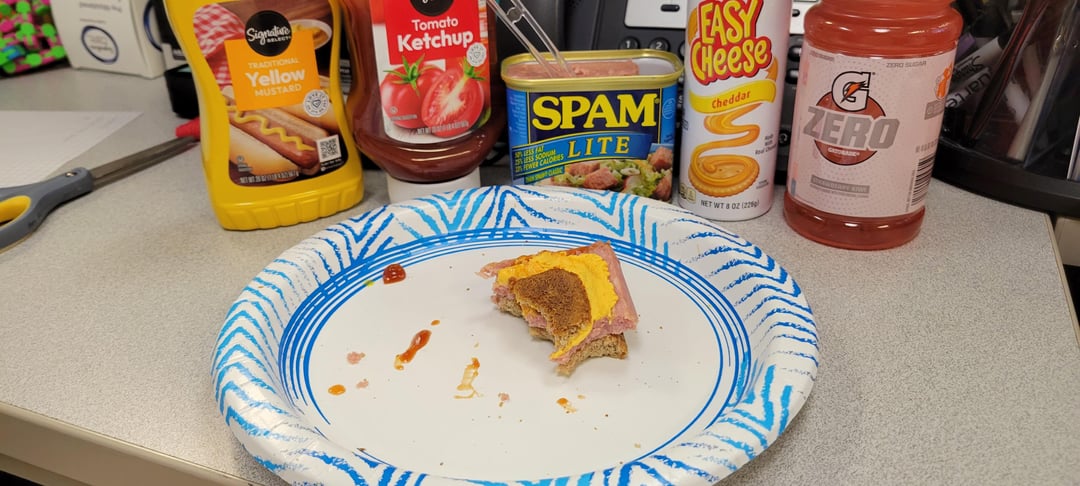 spam lite with cheddar easy cheese, ketchup and mustard. tasted like a cold cheeseburger, very good 😊