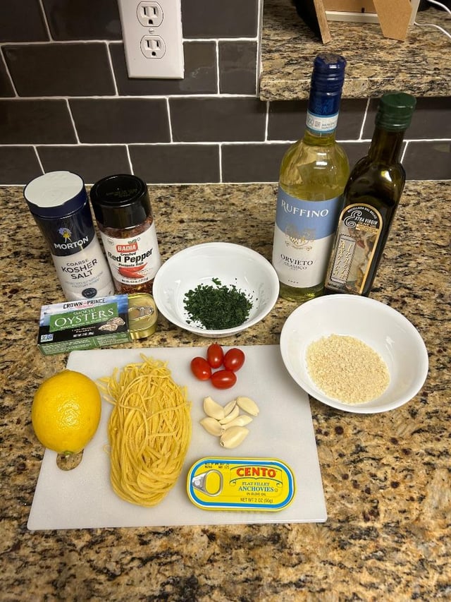 This is my favorite pasta dish to make: Linguine with smoked oyster. I know oyster isn't traditional, but the dish does have heavy Southern Italian influence (or at least I'd like to think so). Sauce base is olive oil, garlic, anchovies, pepper flakes, and parseley.