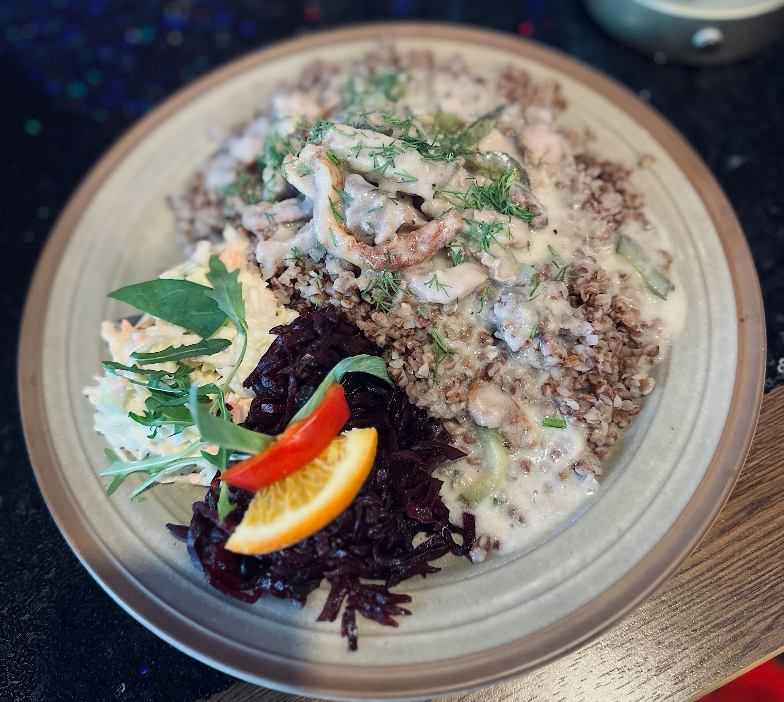 Kurzeme Stroganoff with buckwheat, beet and carrot+cabbage salad