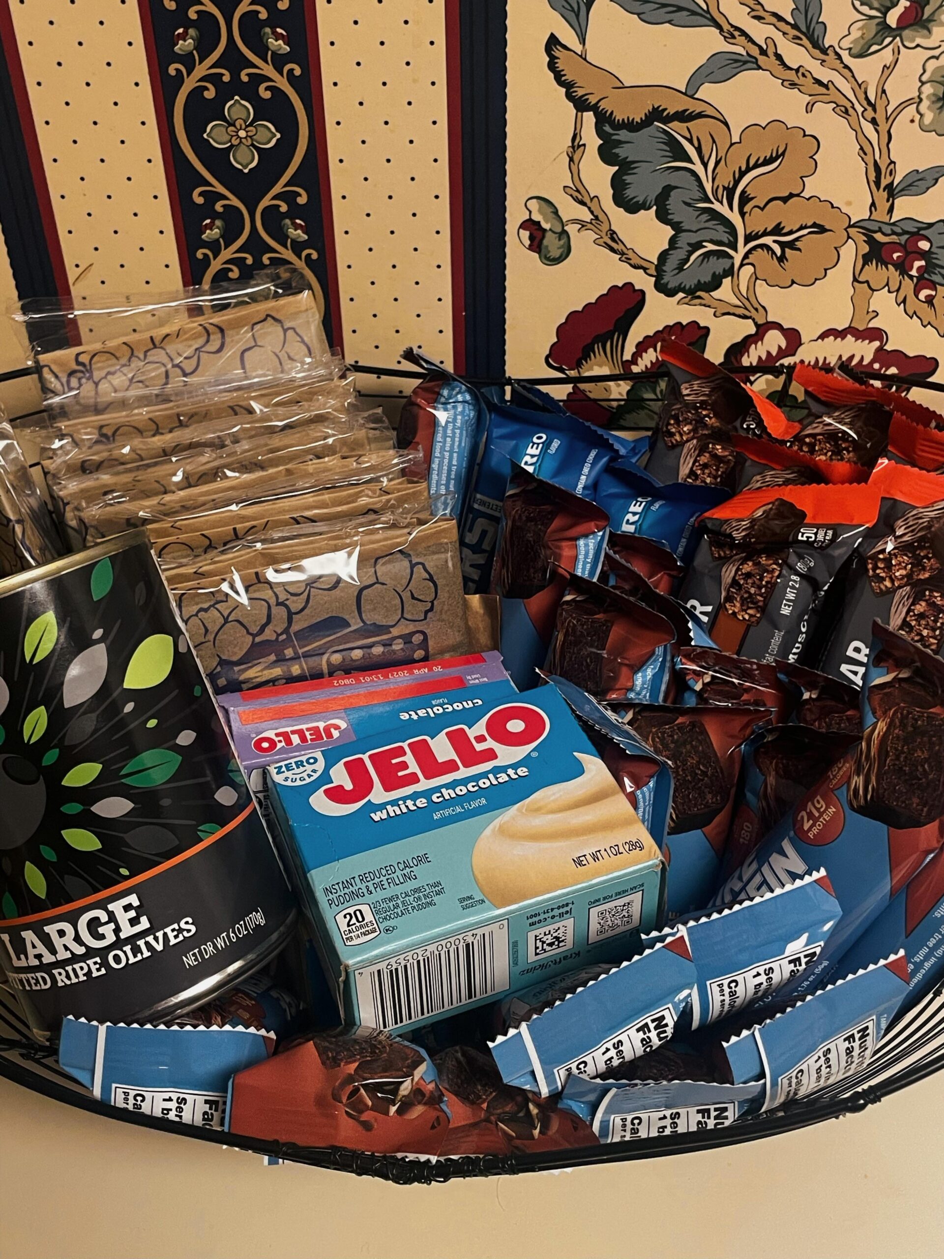 low fat popcorn, jello powders, olives, and a variety of protein bars! having this snack stash made me stop browsing food delivery apps for sweet and salty snacks 🫶🏻