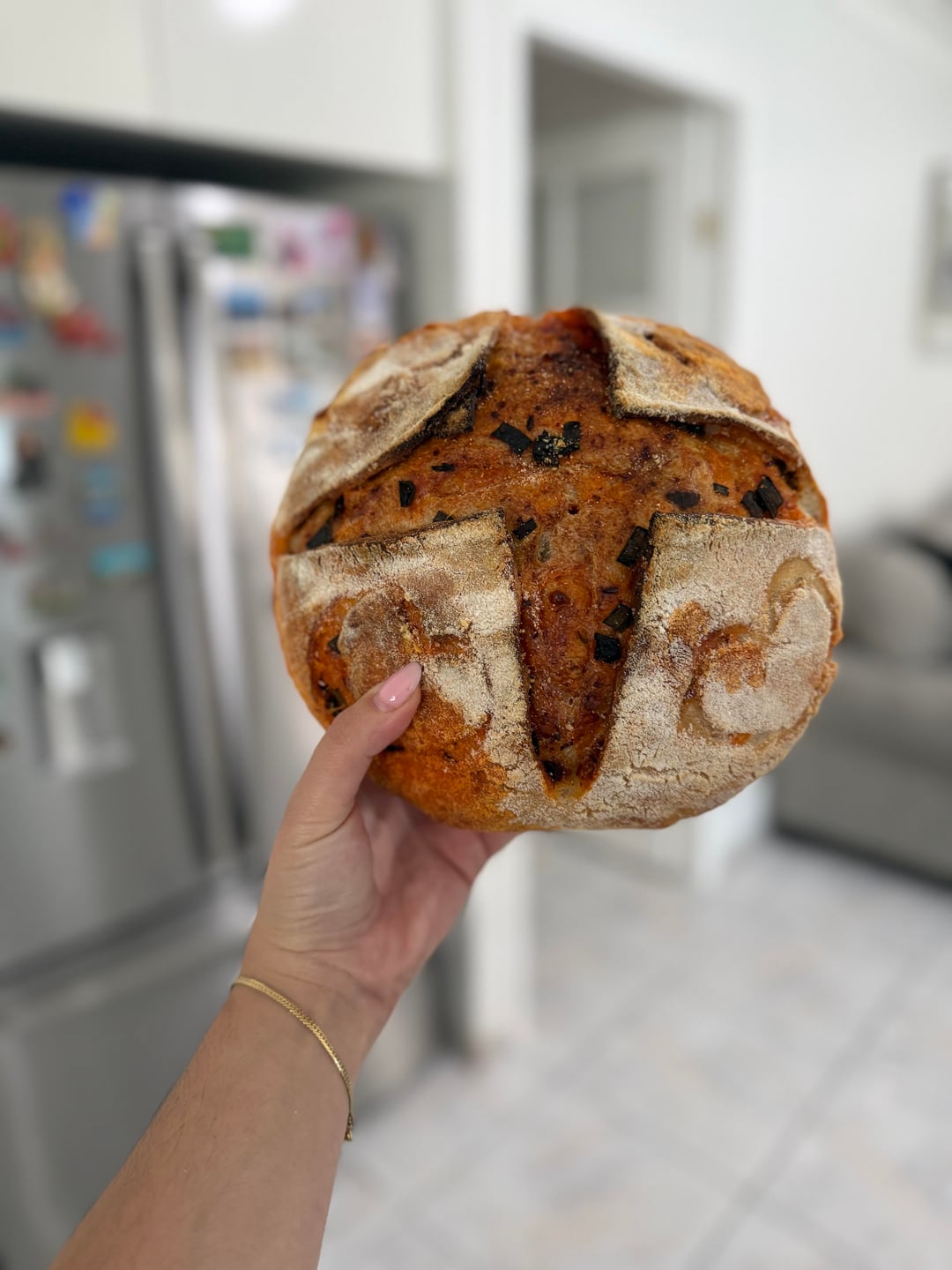 – split in half, laminated inclusions for the chilli loaf, shaped and cold proofed for maybe 25 hours.
