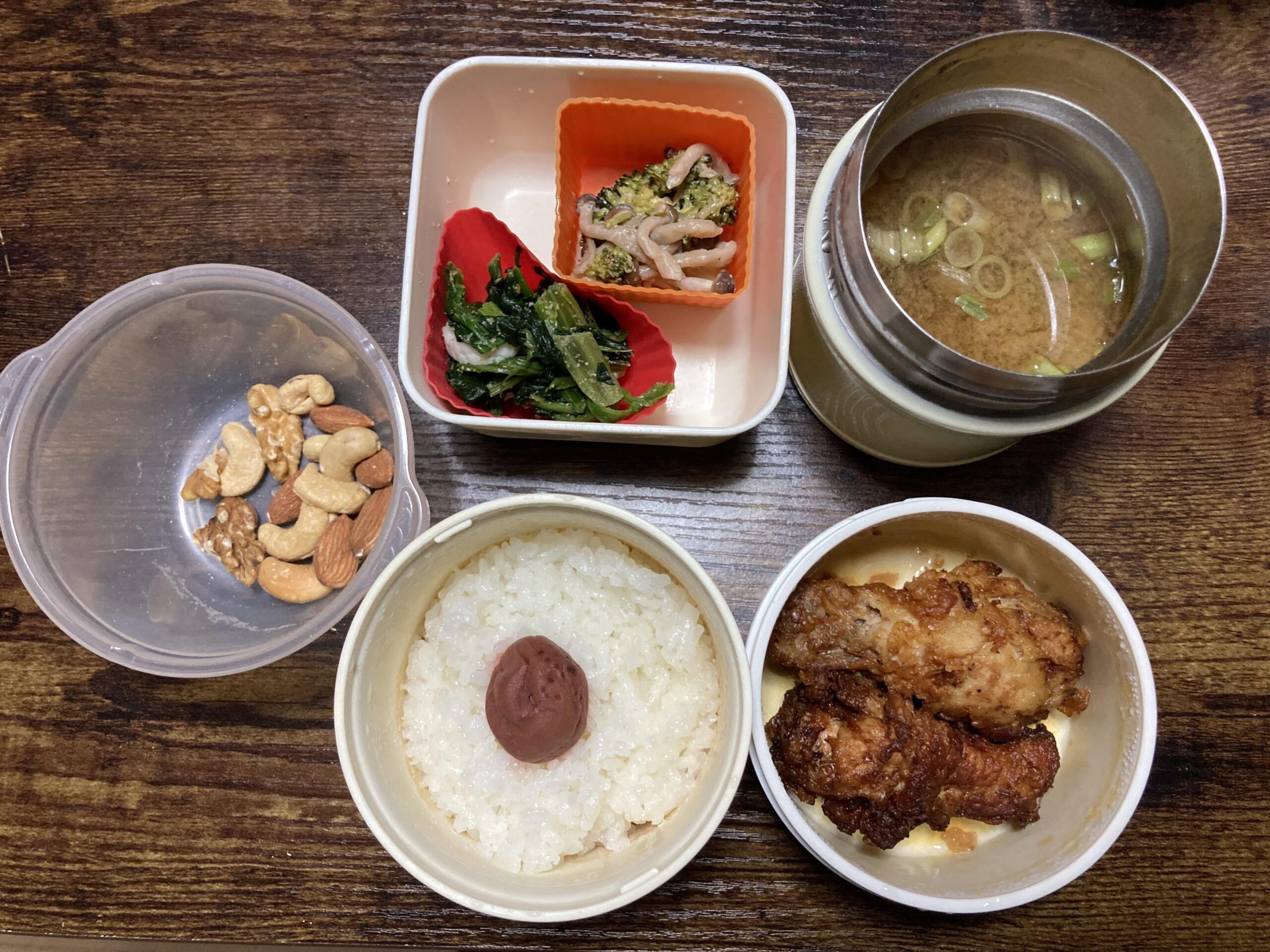 Rice with a large pickled plum (umeboshi). Miso soup.Fried chicken on the bone.Boiled spinach (ohitashi).Broccoli and shimeji mushrooms dressed with mayonnaise.Nuts.by orihasamj Dining and Cooking