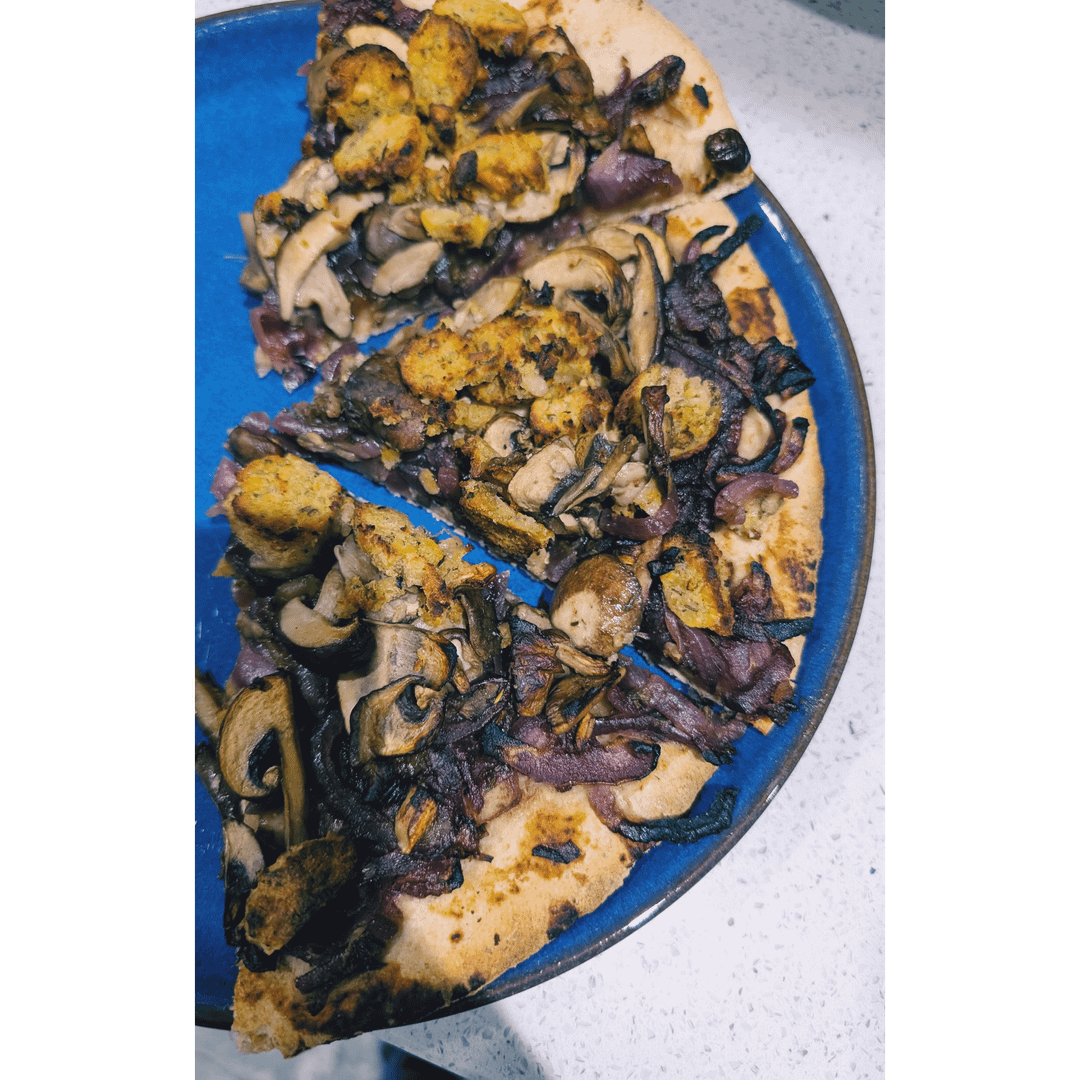 Topped with carmalised onions, balsamic, mushrooms and a veggie sausage. Next time I'd use a soya sausage for more protein and less calories but I only had falafel ones in the freezer. Sorry for the terrible picture I was really hungry 😁