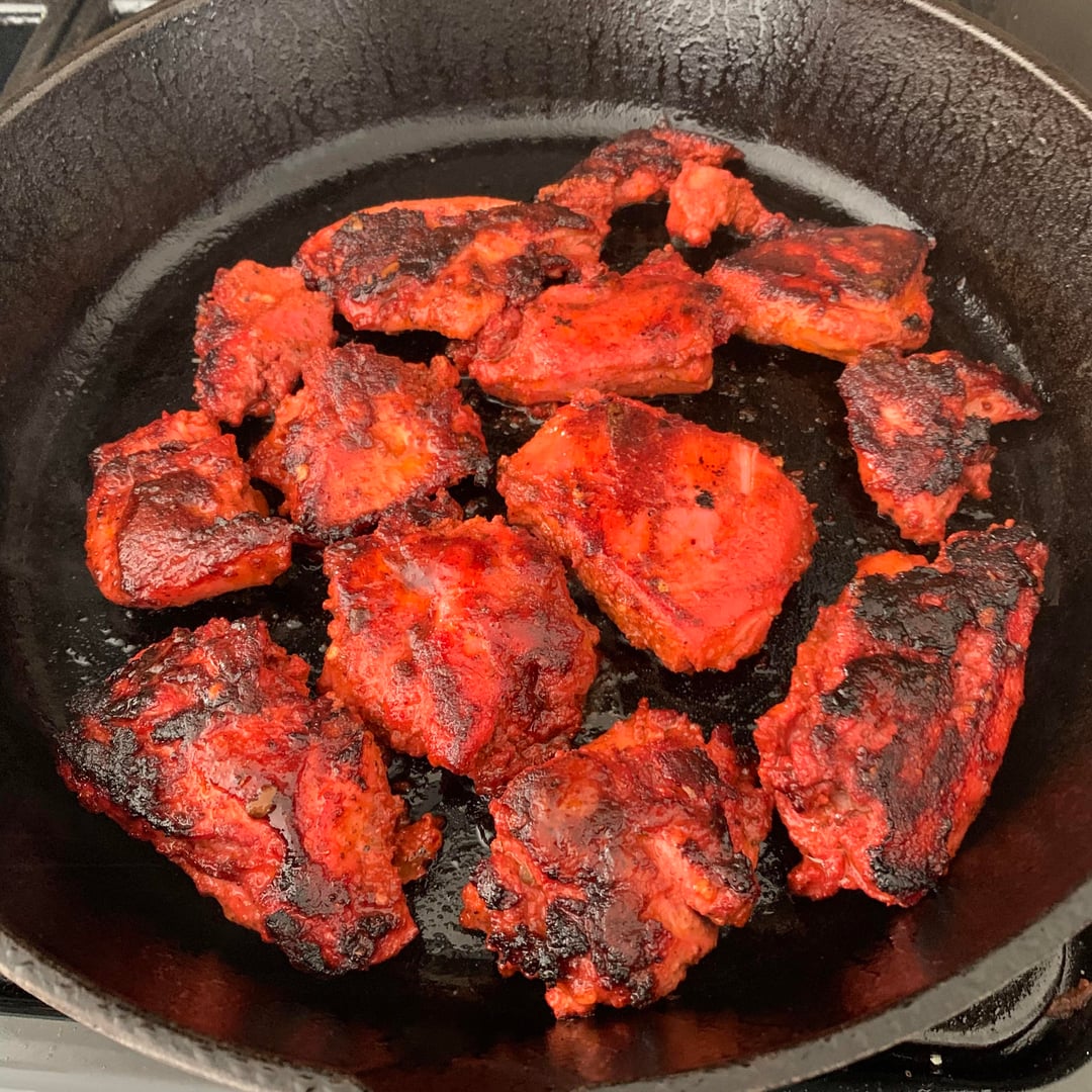In a separate bowl, mix greek yogurt, red food coloring, and oil together. Then add in the dry seasonings and mix until well combined and forms a paste.