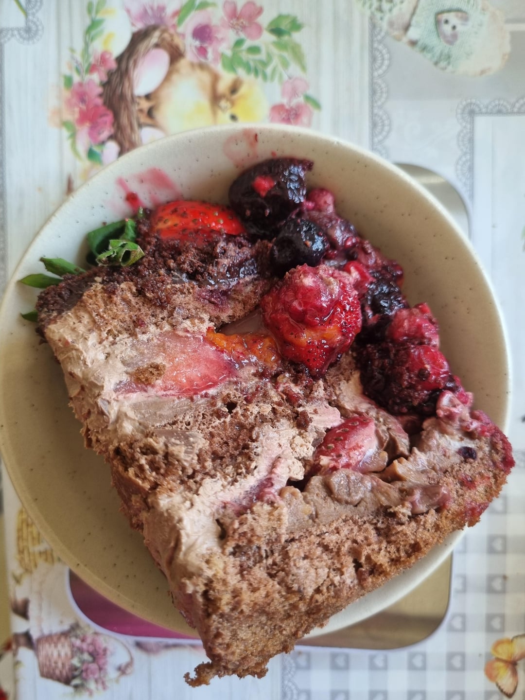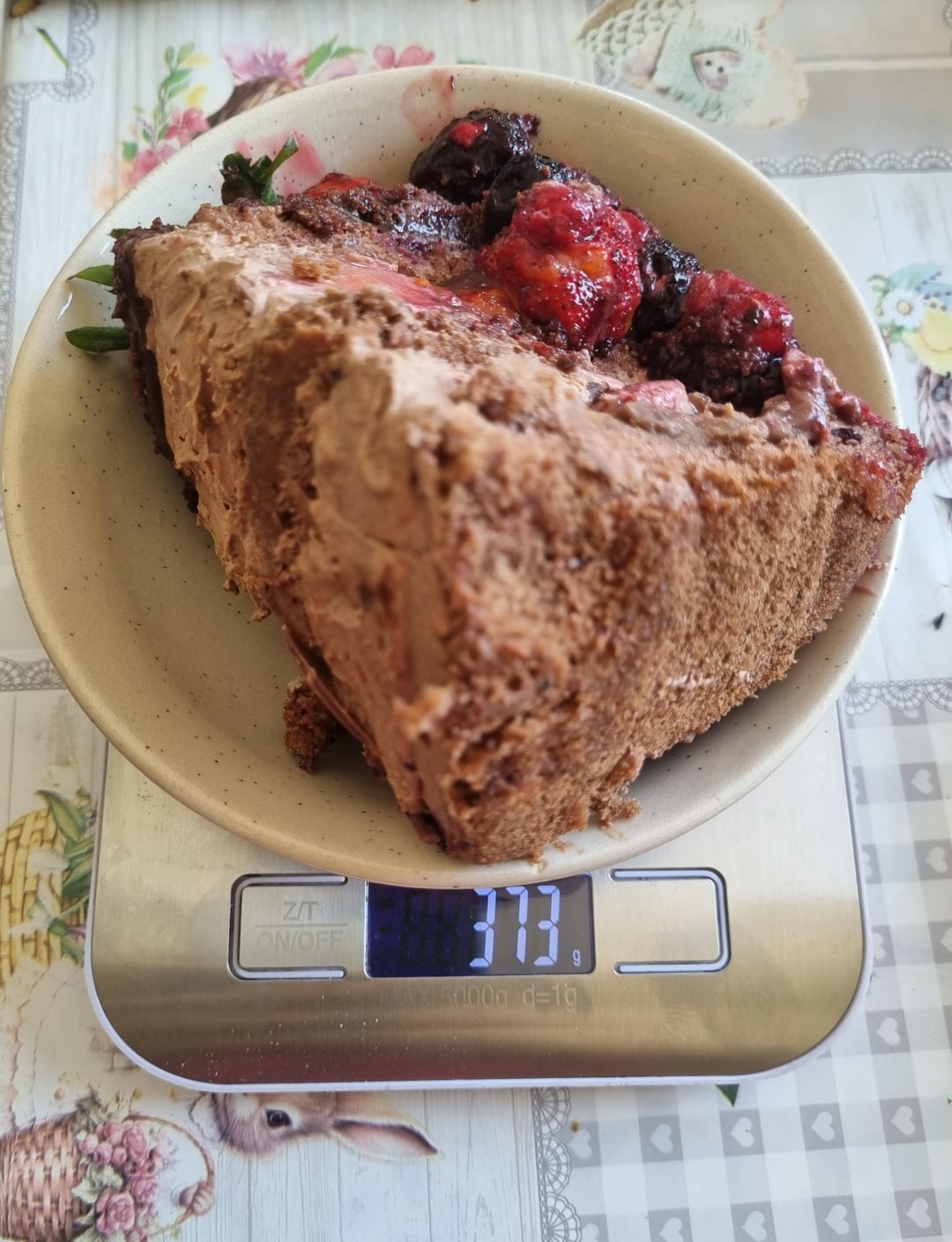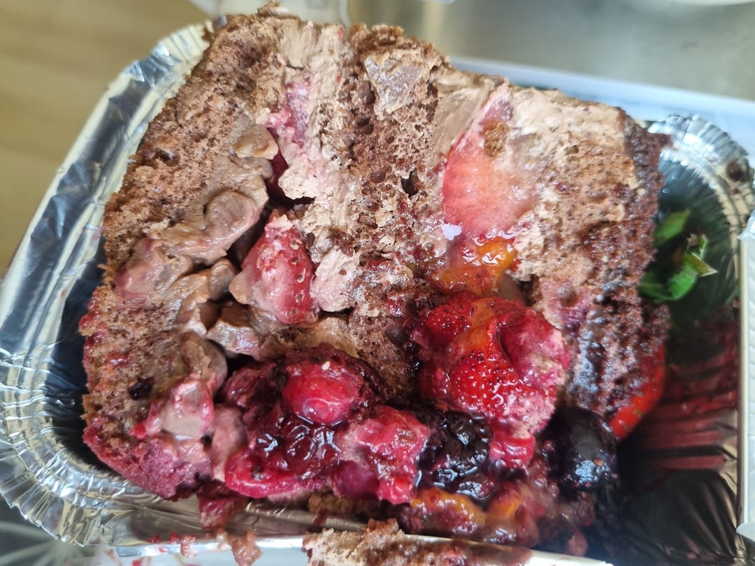 The filling is mousse and cream (not sure) and some chocolate chips with strawberries and a mix of other berries. It is mostly filling than cake. 373 grams