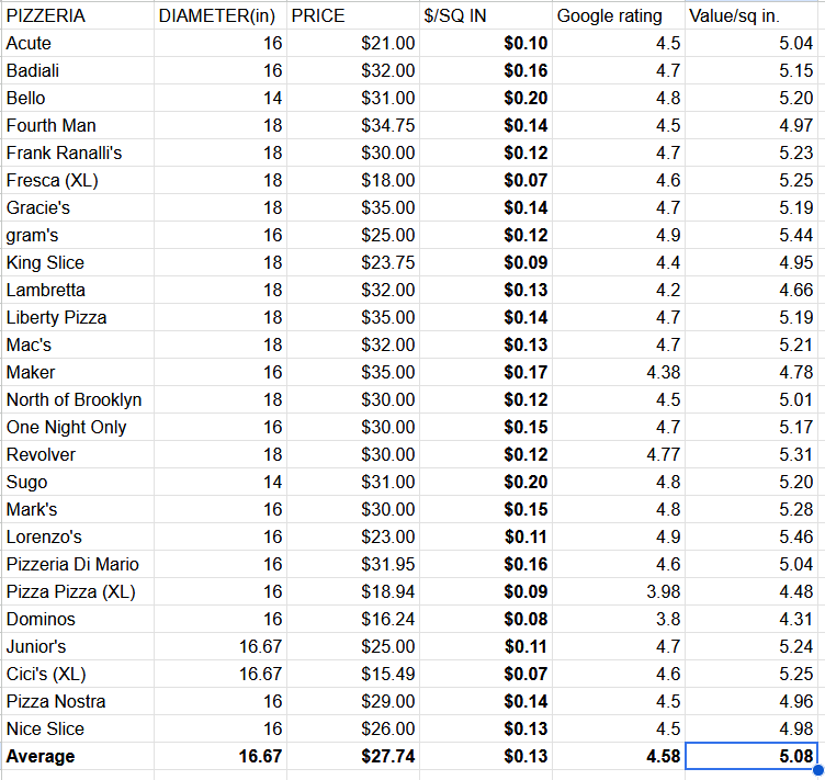 In an extremely problematic attempt to calculate the “value/sq in” I incorporated each pizzeria’s Google rating into the score. I know, I know. But it’s the only data I have that is *sort of* useful in that way. For pizzerias with several locations, like NoB or Maker, I took their average rating. For the two big chains I included, I averaged the ratings of the 5 closest stores to me.