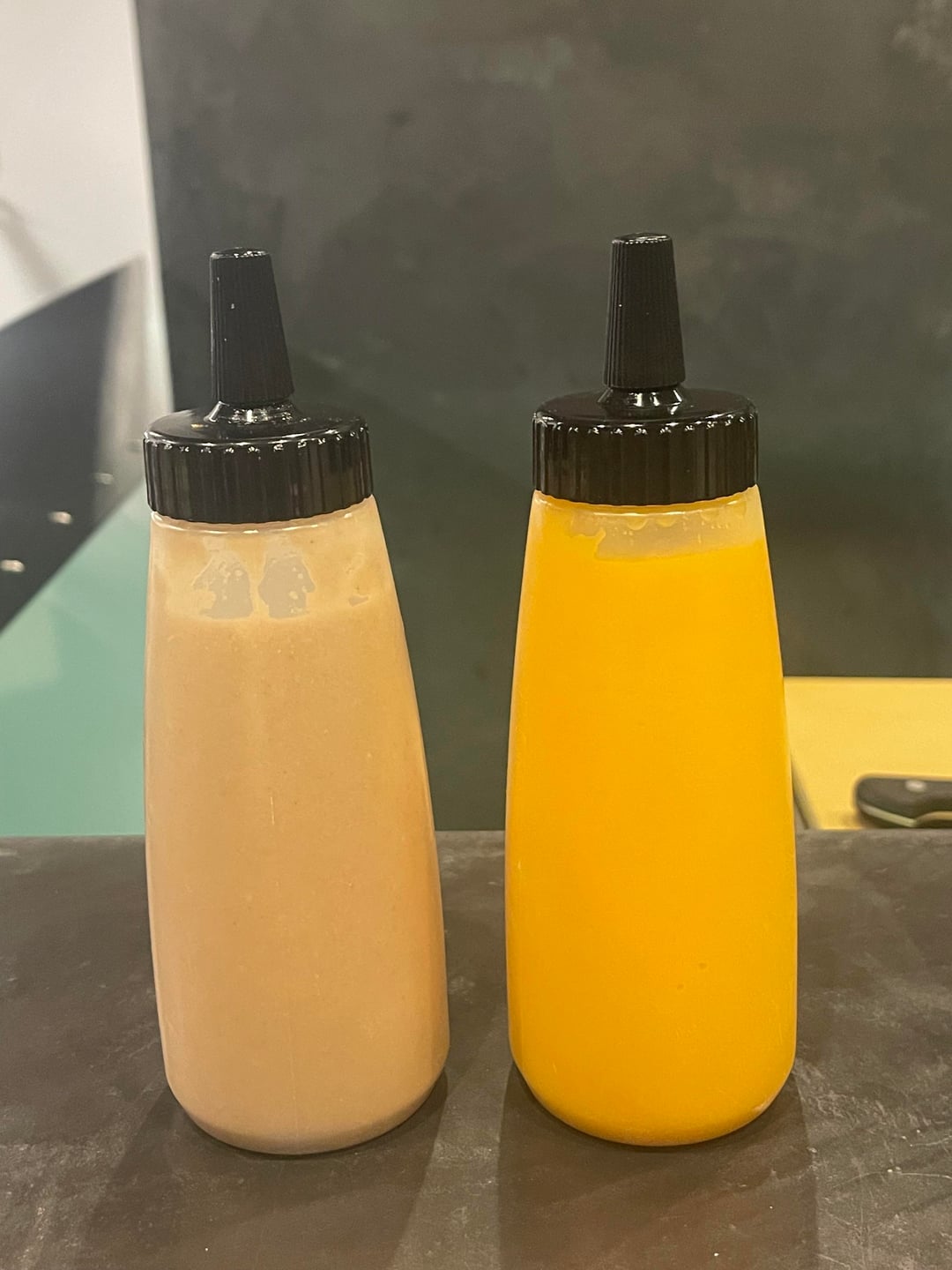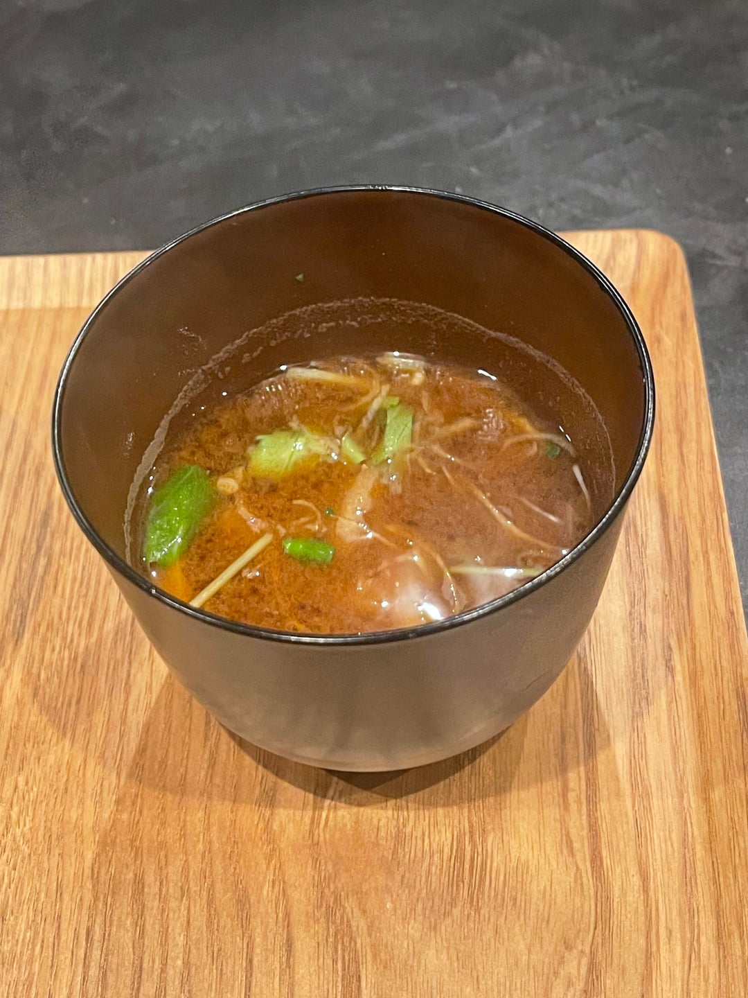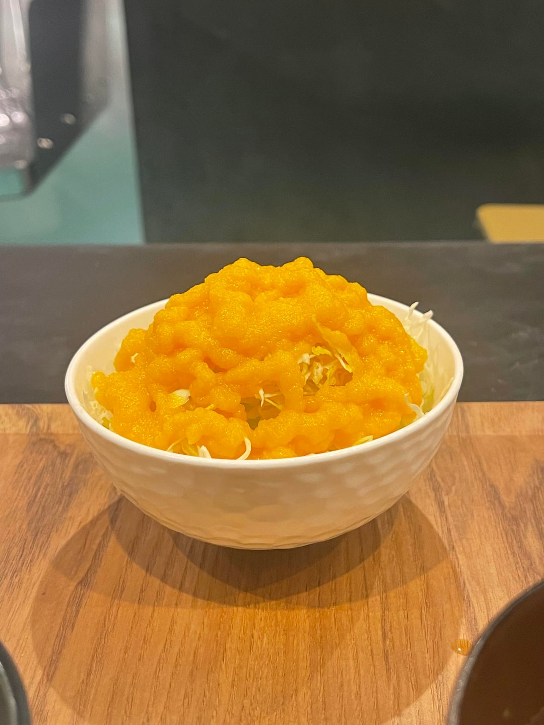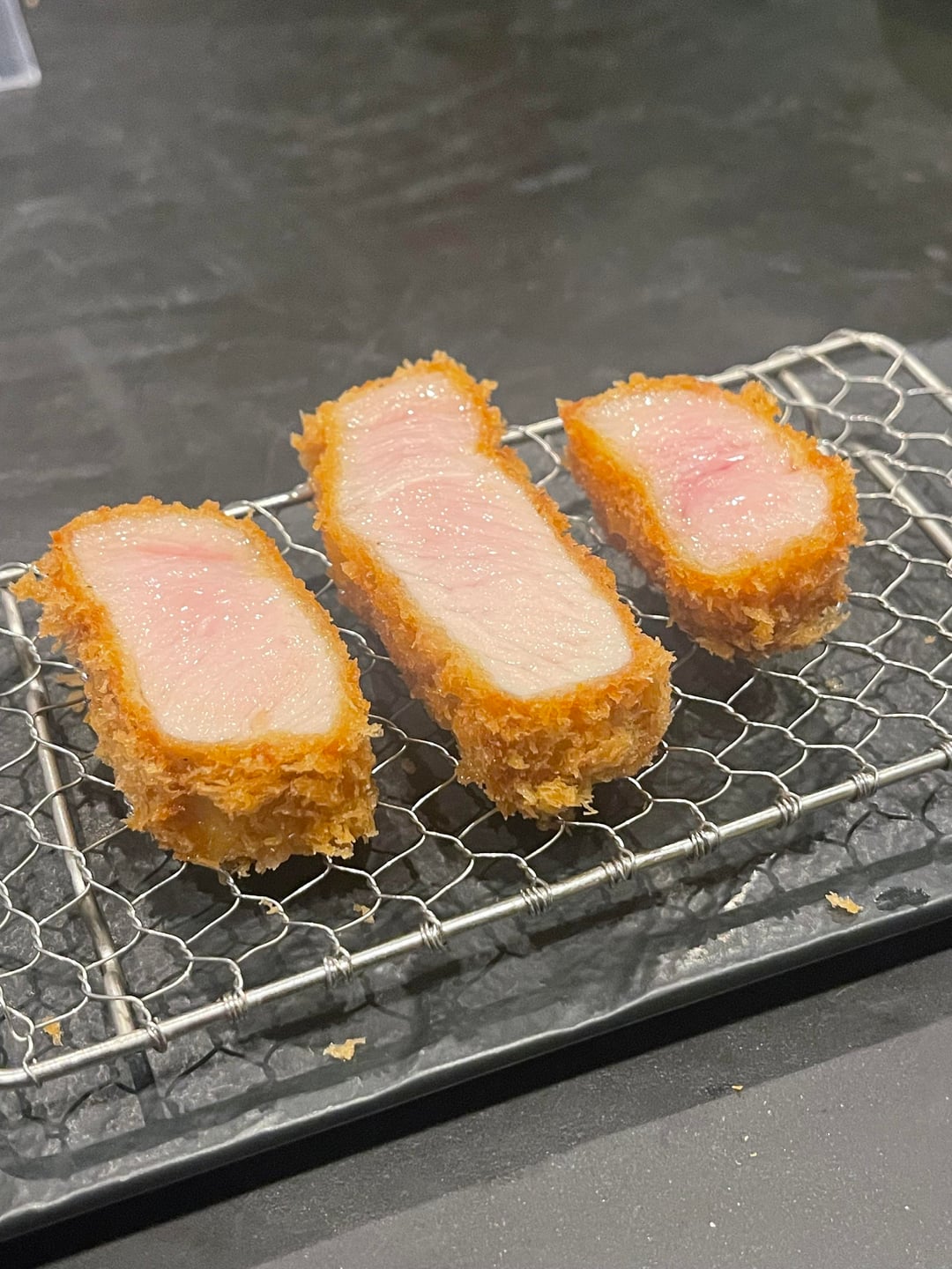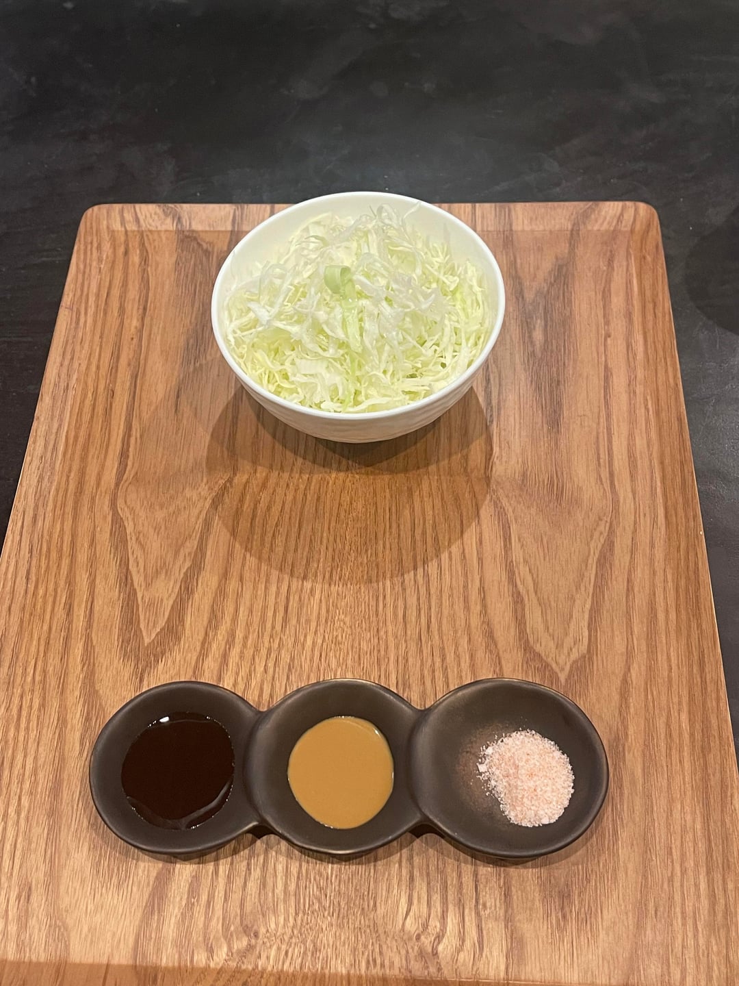 The chef is a French cuisine-trained and applies some of the French techniques into the food preparation such as adding a hint of vanilla into panko crumbs to imbue fragrance, making homemade carrot sauce for the cabbage salad, and incorporating red wine into the tonkatsu sauce. The dipping salt is a blend of Japanese, Himalayan and French salt.