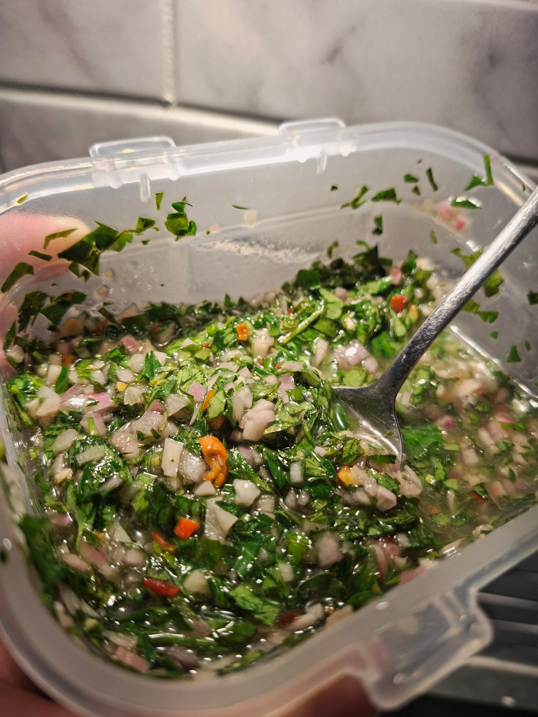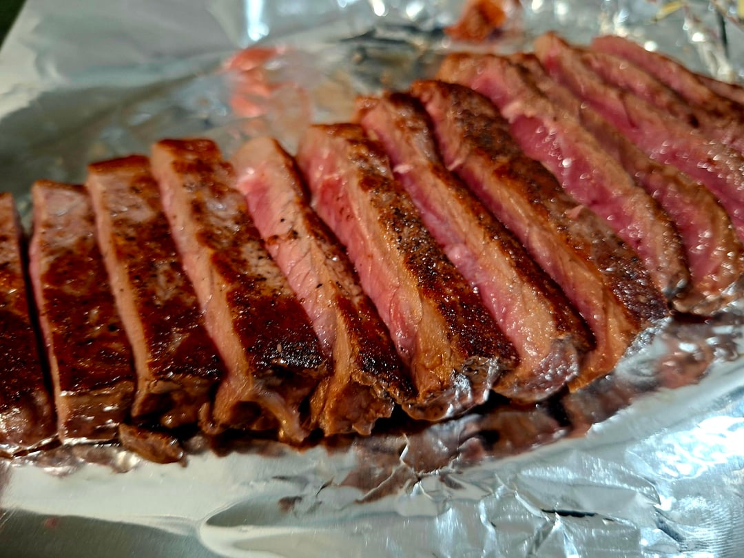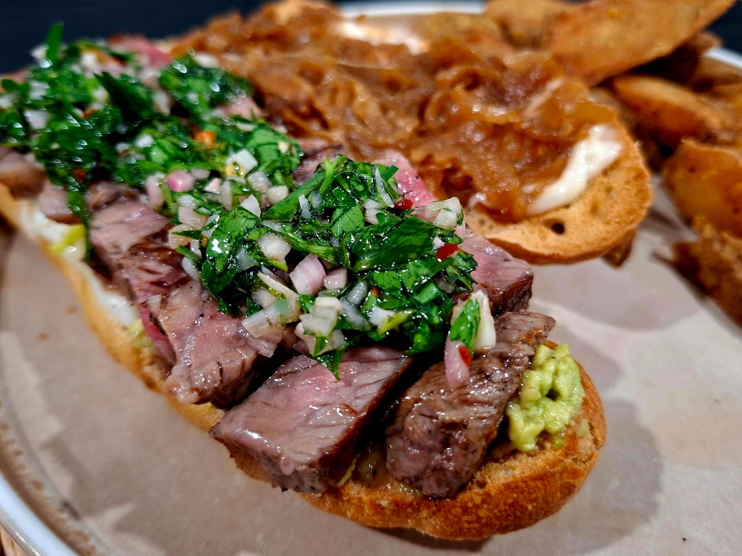 avocado, NY strip, chimichurri, caramelized onions.
