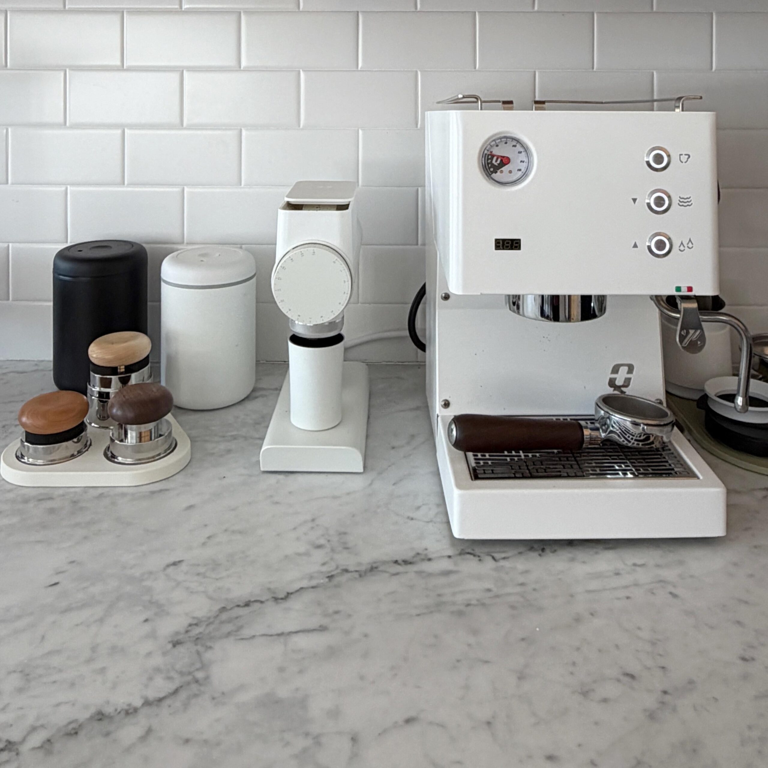 Finally setup is complete-ish! Quick Mill Pop-Up, Timemore Sculpture 064S, Timemore PUCKS set, Quick Mill bottomless portafilter. Shots taste great, Still need to figure out the steaming. Loving it so far!