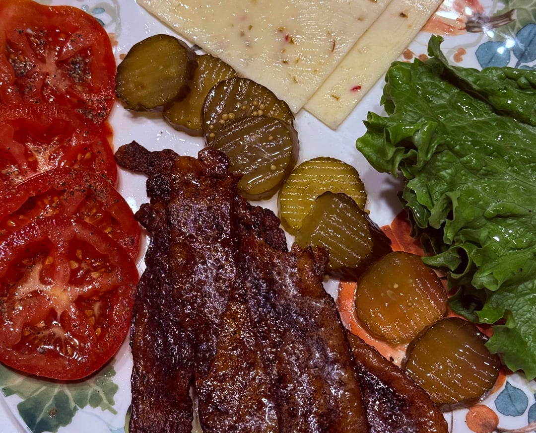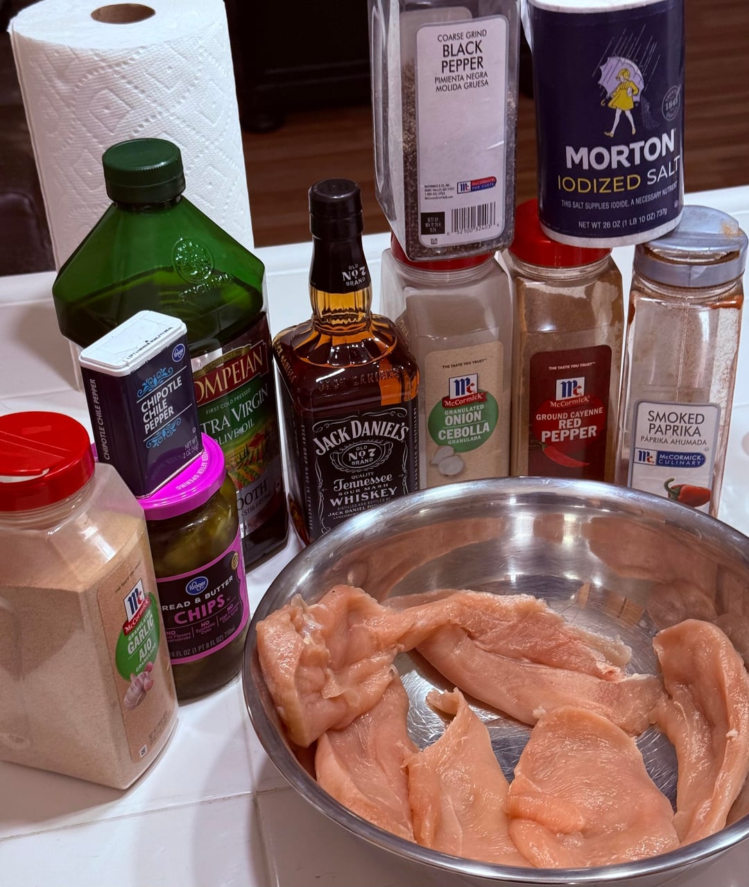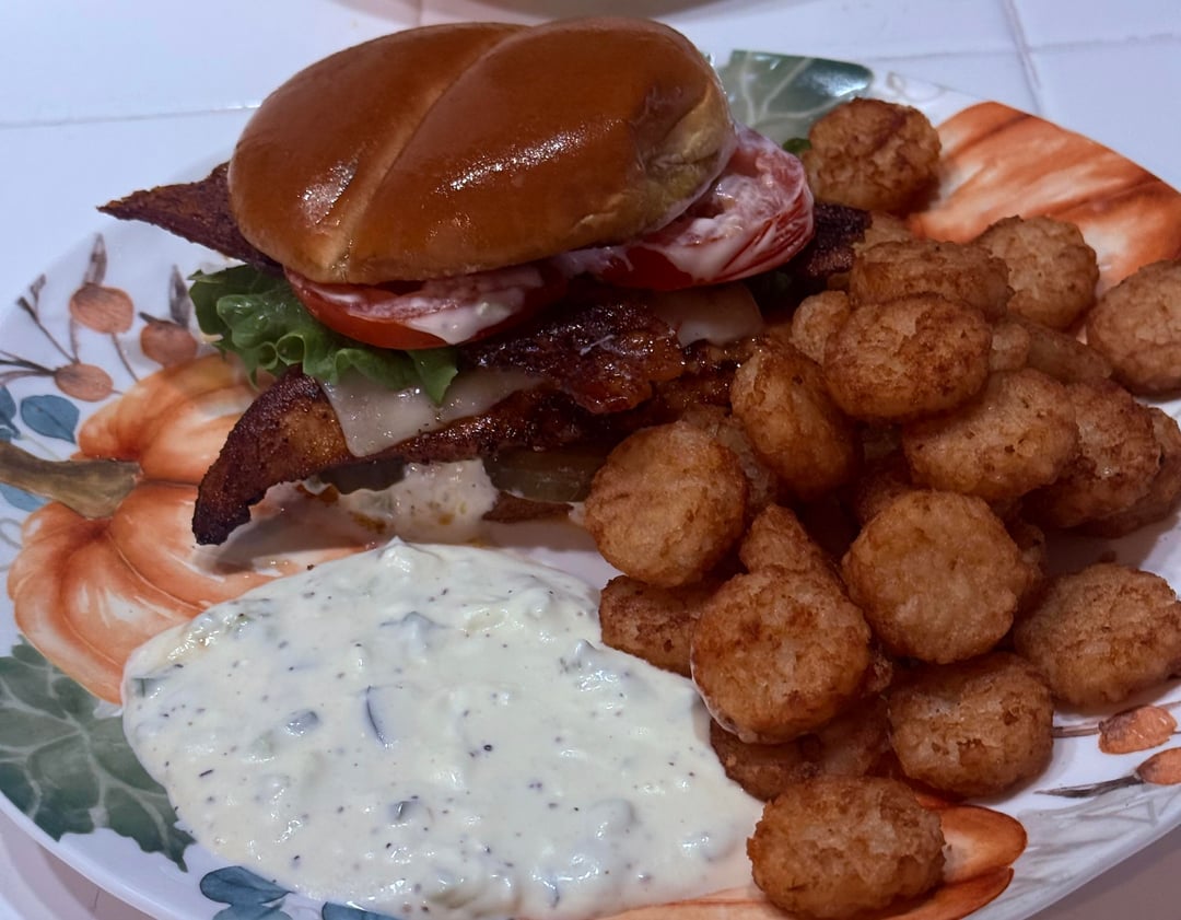 use thick portobello mushrooms marinated the same way as the chicken in whiskey, olive oil, smoked paprika, chipotle, cayenne, garlic, onion, salt and pepper, grilled hard so they get some real char. Instead of bacon use crispy onion rings tossed with the same smoked paprika and black pepper seasoning, pepper jack on top, bread and butter pickles, tomato, green leaf lettuce, all on a toasted brioche bun, finished with that jalapeño honey sauce with mayo, sour cream, fresh jalapeño, honey, olive oil and a splash of vinegar. Tater rounds on the side