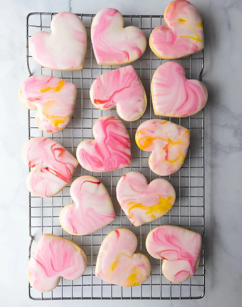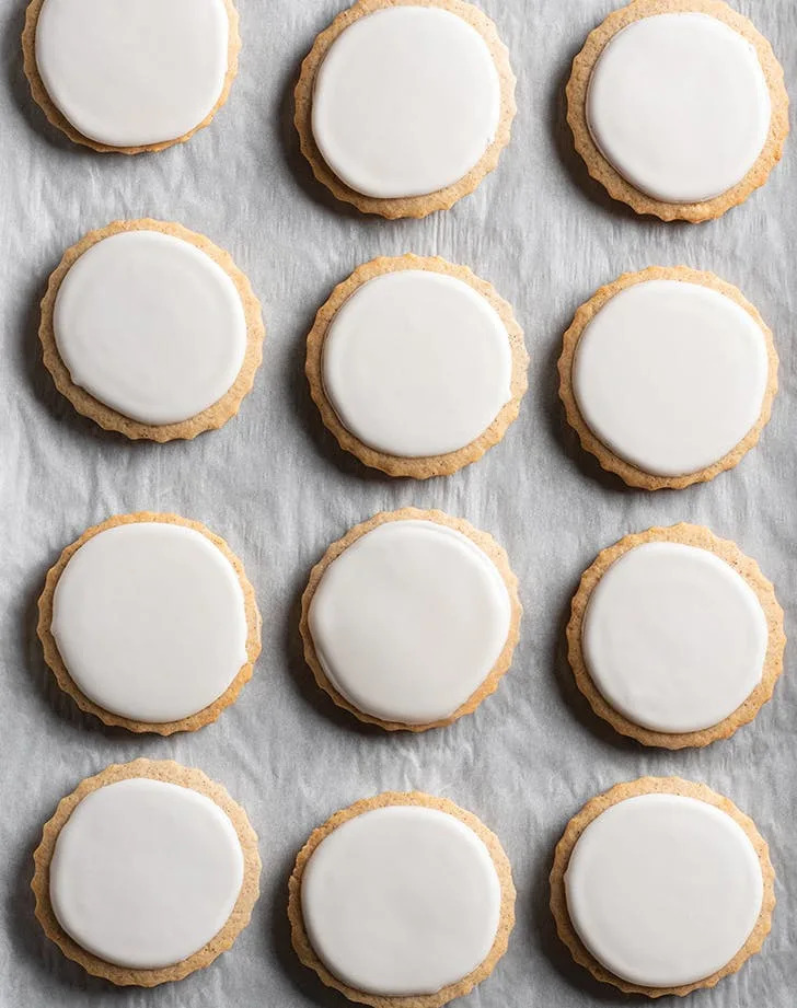 When you don’t plan on piping elaborate designs but still want to dress up a batch of sugar cookies, a simple glaze of confectioners’ sugar and water (or milk) will get the job done. It’s great for dipping and swirling with food coloring, and if you add a few teaspoons of corn syrup, it will dry shiny.