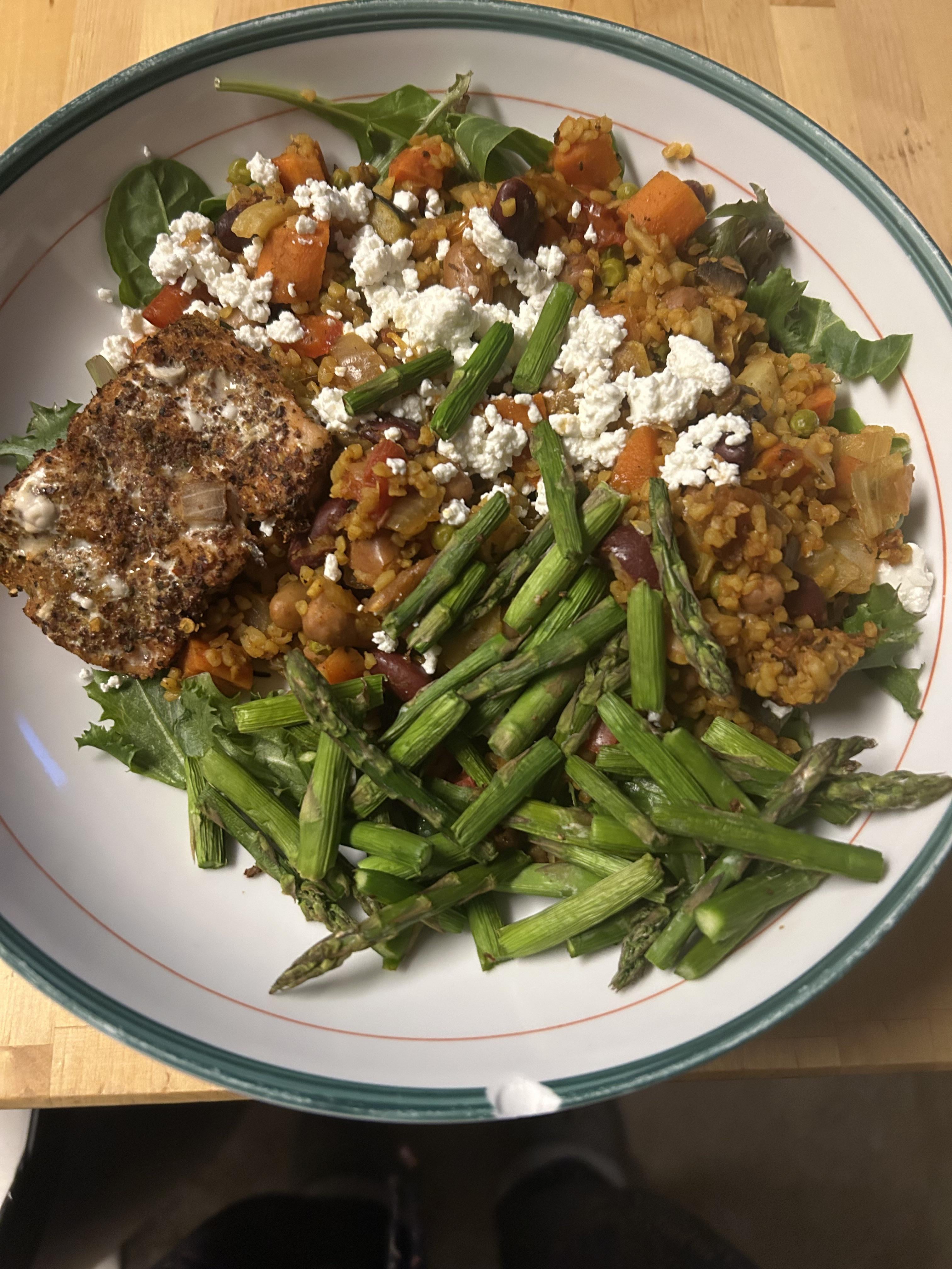 Roasted vegetable, beans and bulgur baked salad with salmon and asparagus. Made enough of the salad to last all week for lunch. More in comments
