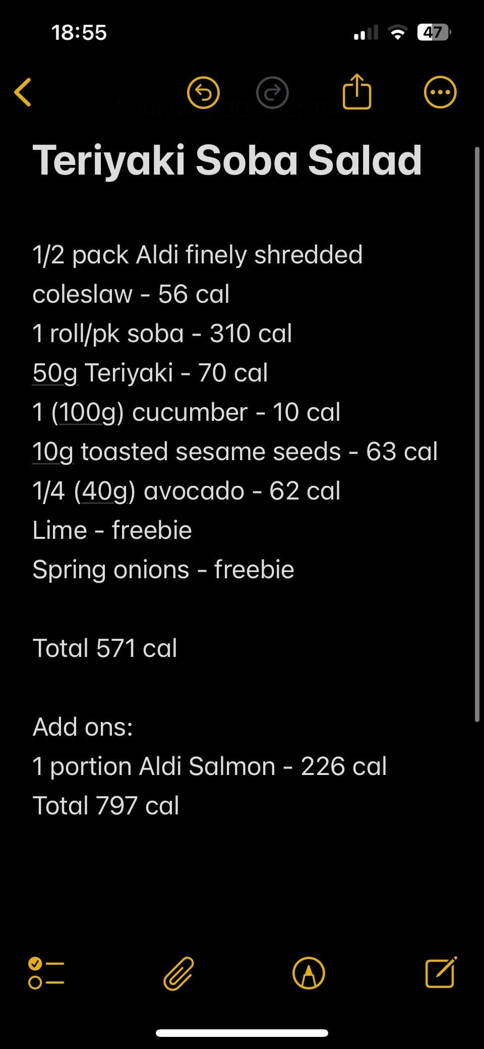 I simplified an old favourite salmon and rainbow vegetable soba bowl, using store-bought teriyaki and a pack of finely shredded coleslaw mix instead of the cabbage/carrot/radish I would normally use. Didn’t use salmon tonight but still delicious and filling for under 600 kcal. This is a salad serving bowl (not standard meal bowl) for size reference. Not pretty, but tasty!