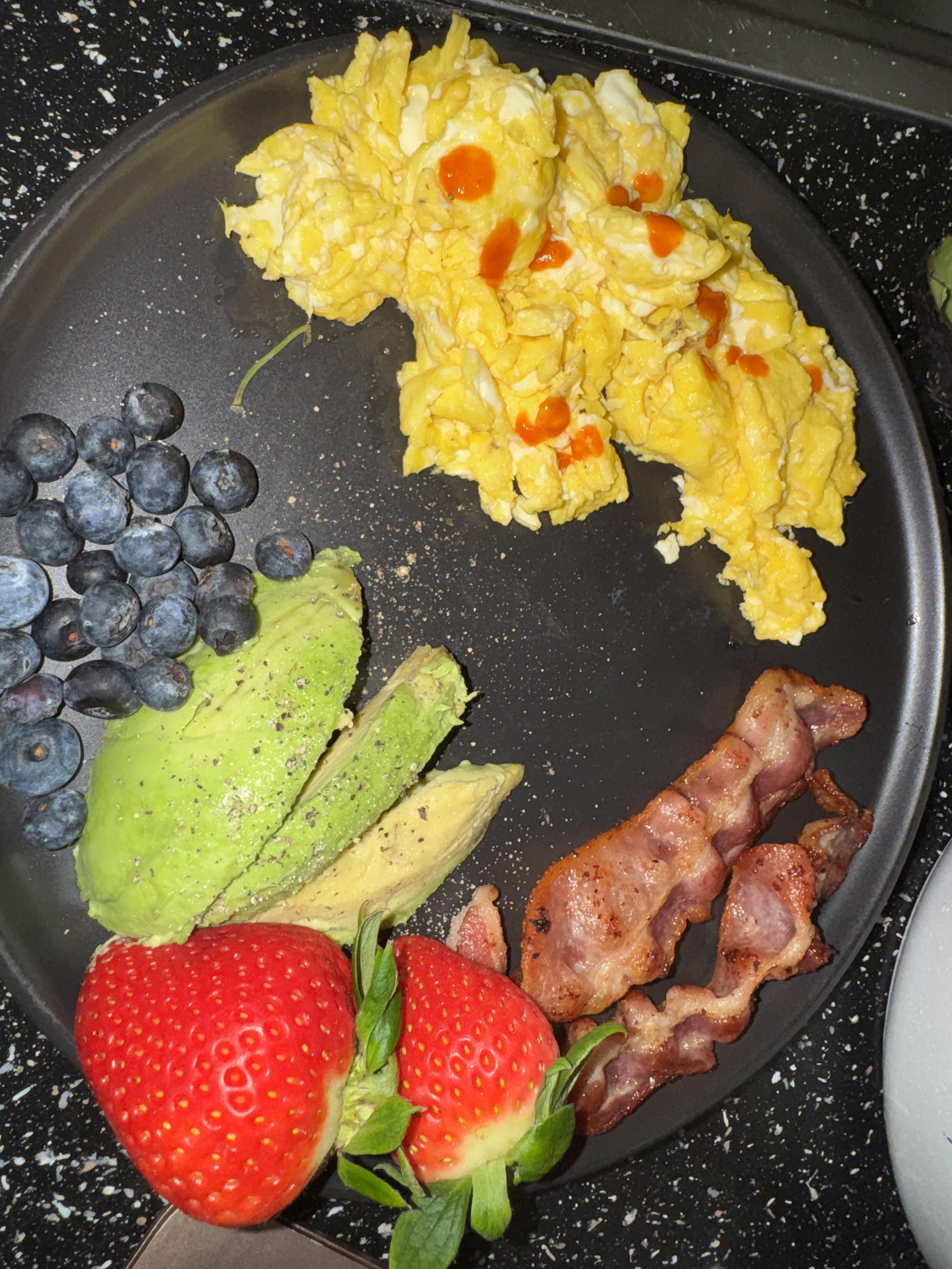 IMO it’s a good start! Lots of fiber in your blueberries, strawberries and avocado. Protein and fat with your eggs. But as others suggest bacon isn’t the greatest because of the saturated fats. Once in awhile is great, of course, you gotta live and enjoy!