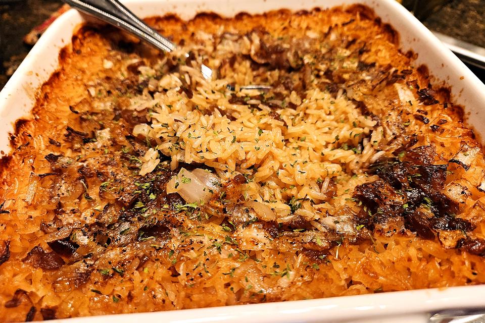 baked rice recipe has only four ingredients and takes about five minutes (if that) to prep for the oven. While the rice bakes, you have time to make the main dish. Here are the simple four ingredients you need to make this rice tonight: long-grain white rice, a can of beef broth, a can of french onion soup and butter. The ingredients are layered in a square baking dish and it takes about 50 minutes for rice perfection to emerge from the oven.