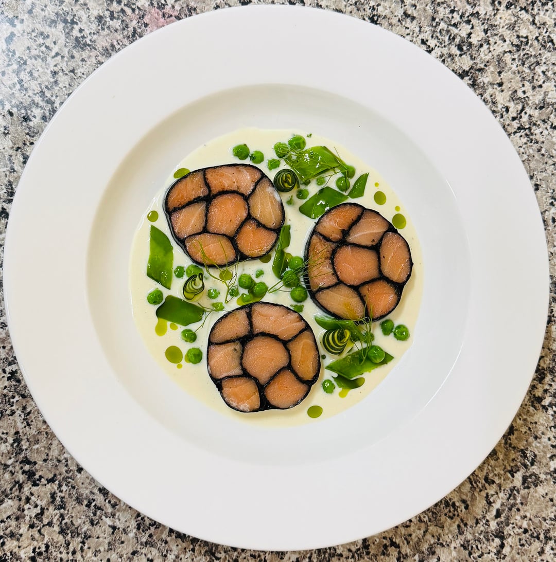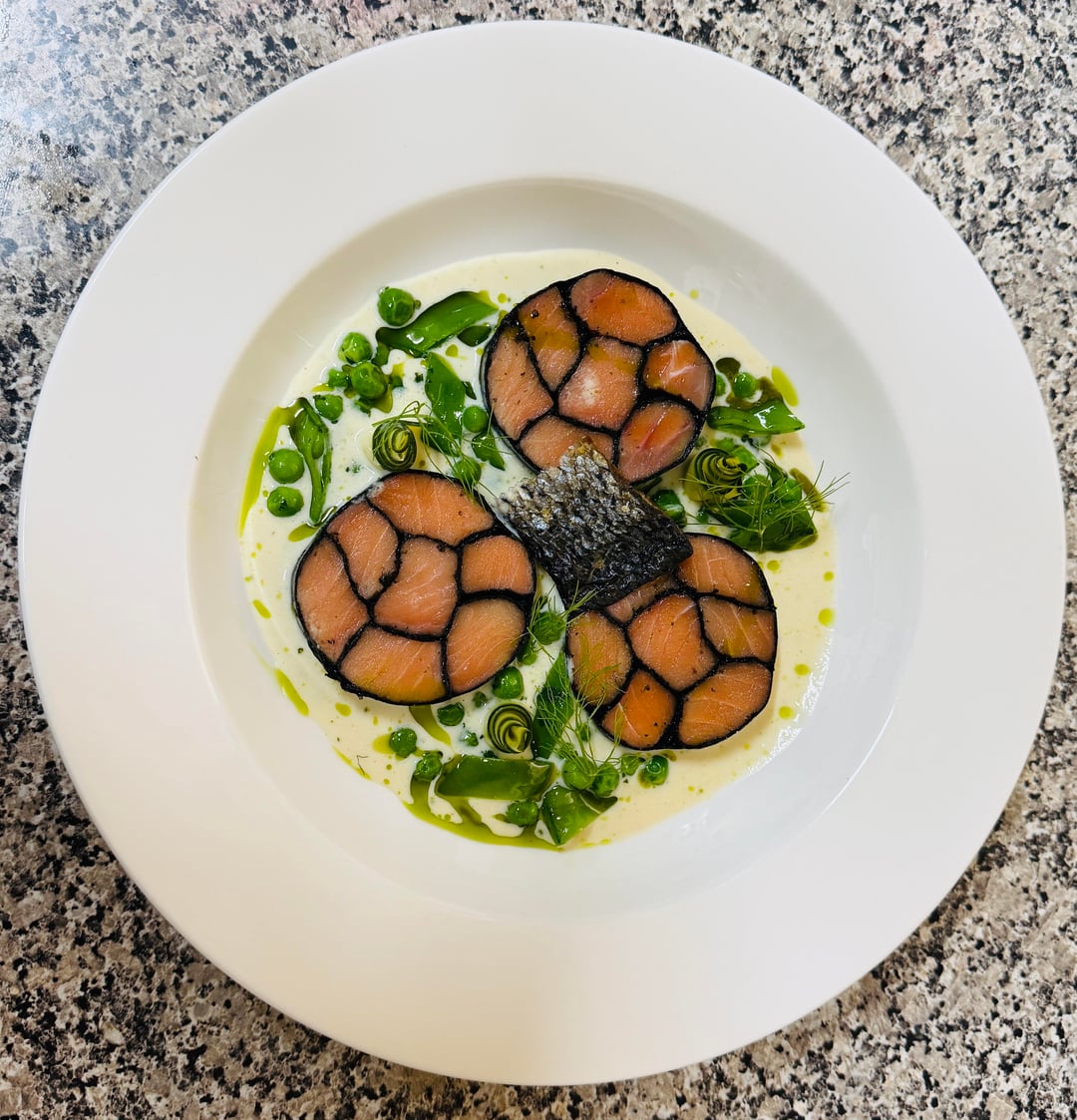 Roll the torchon larger, 1 piece not 3. White sauce washed out on a white plate. Garnish too busy, reduce volume and place elements intentionally. Cuisson on salmon is meh, brush with a syrup you make from the bones or something..