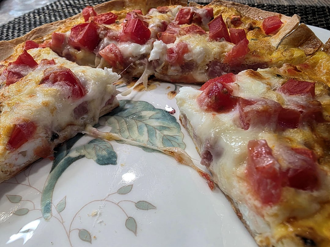 Diced ham and spam, roma tomato, shredded moz. Eggs soft set,